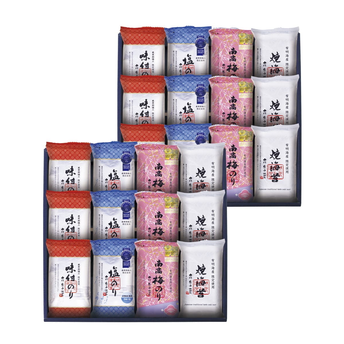 [金賞銀賞 食べくらべ海苔GIFT GSNR-ED2] 最高の食べ比べ海苔紀州南高梅の薫りと海苔そのものの風味の「南高梅のり」と、海苔そのものの素材を精一杯活かすために職人達が真剣勝負で仕上げた「有明海産塩のり」などの詰合せモンドセレクション2021優秀品質賞金賞受賞南高梅のり有明海産海苔香り高い南高梅を独自の製法で仕上げ、秘伝の梅だれを作りあげました。日本一の産地であり、豊かな磯の香りと歯切れの良い有明海産海苔に梅だれの仕上げをした相性抜群の「南高梅のり」を心ゆくまでご堪能くださいモンドセレクション2020優秀品質賞銀賞受賞塩のり有明海産海苔男鹿半島で古くから用いられてきた製法と原料を使ってできた国産自然海塩を使用して、秘伝の塩だれを作りあげました。豊かな磯の香りと歯切れの良い有明海産海苔に塩だれの仕上げをした相性抜群の美味しい「塩のり」をご堪能ください二段重ね
