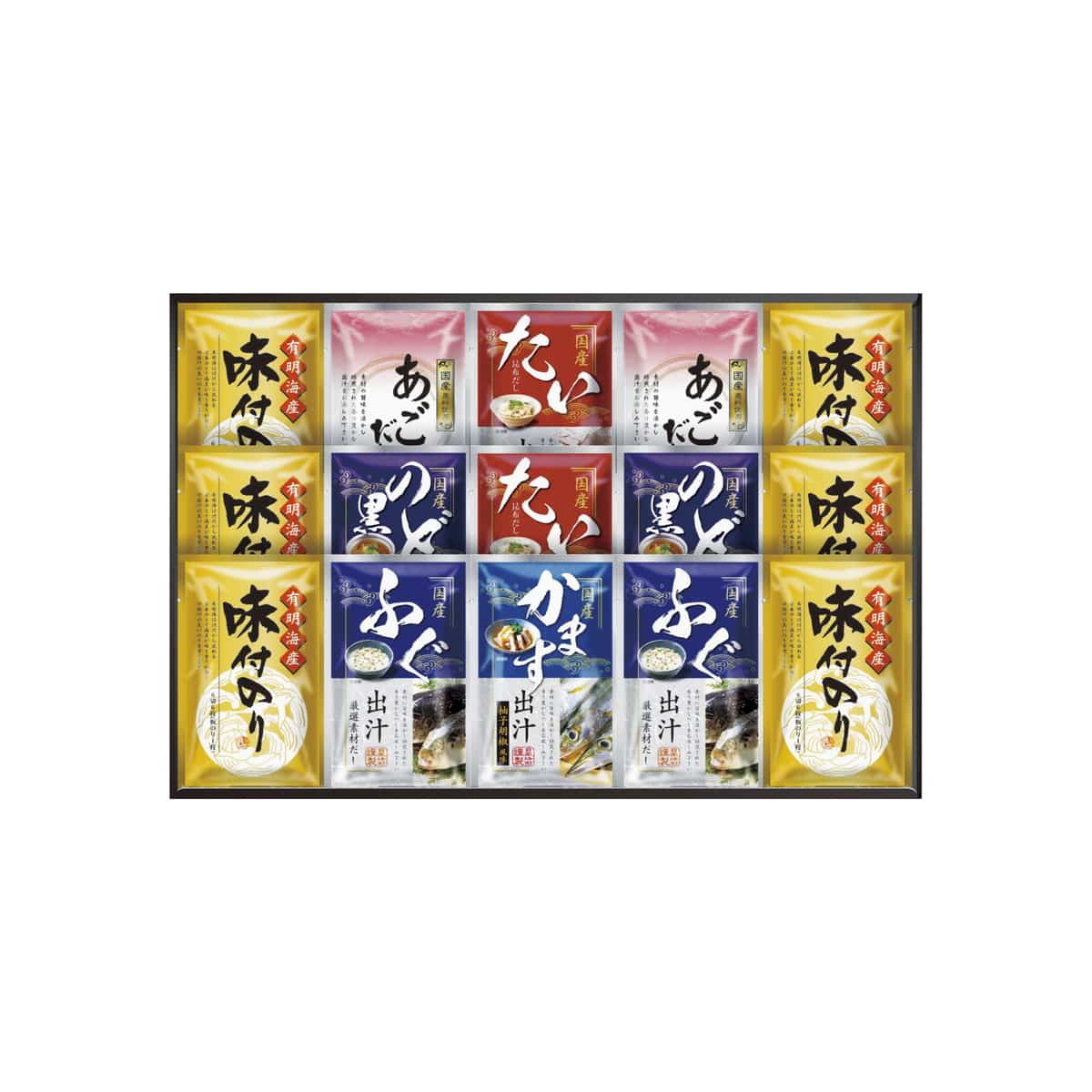 ●数量・内容:味付海苔(6切6枚)×6・あごだし(8g×2)×2・かますだし(8g×2)・たいだし(8g×2)×2・ふぐだし(8g×2)×2・のどぐろだし(8g×2)×2 【小麦・えび・かに】