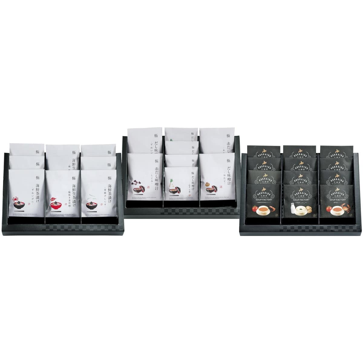 ●数量・内容:海鮮 だし味噌汁(生タイプ)ネギ・わかめ具材付き(かに×1・帆立×1)、貝 赤だし味噌汁(生タイプ)ネギ・わかめ具材付き(あさり×1・しじみ×1)、極だしわかめ入り味噌汁(生タイプ)(ネギと豆腐×2・キャベツとわかめ×1・かぼちゃとほうれんそう×1)、こだわりのスープ(濃厚カニビスク×2・海鮮の旨みブイヤベース×2・完熟とまとのミネストローネ×2)、【生】海鮮茶漬け(極・根昆布だし)わかめ・白ゴマ・きざみ海苔付き(塩挽き国産金目鯛×1・北海道産 焼き新巻鮭×1)、海鮮茶漬け(昆布だし)(かに×1・帆立×1・明太子×1・釜揚げしらす×2)、昆布だし梅茶漬け(特選 紀州南高梅×1)、北海道産スープ(じゃがいものビシソワーズ×2・南蛮海老のビスク×2 生クリームのクラムチャウダー×2) 【卵・乳成分・小麦・えび・かに】