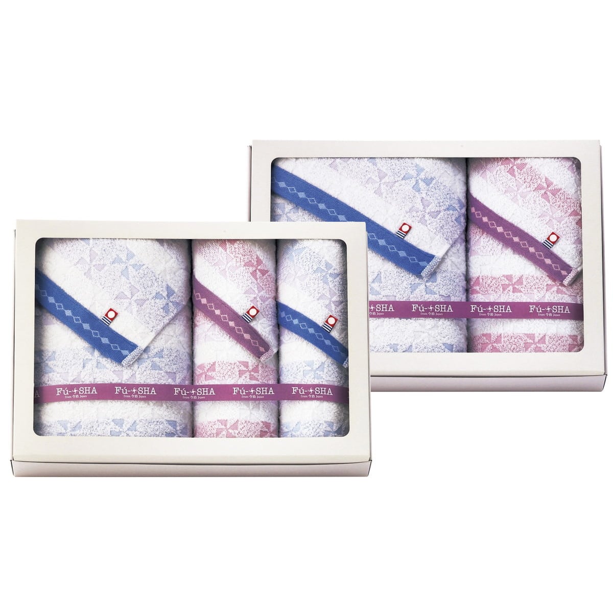 [Fu-SHA(風車) 今治産 タオルセット(二段重ね) FS-HO] ボーダーに涼しげな風車の柄をあしらいました。軽やかで扱いやすく、水分を良く吸収します。二段重ね