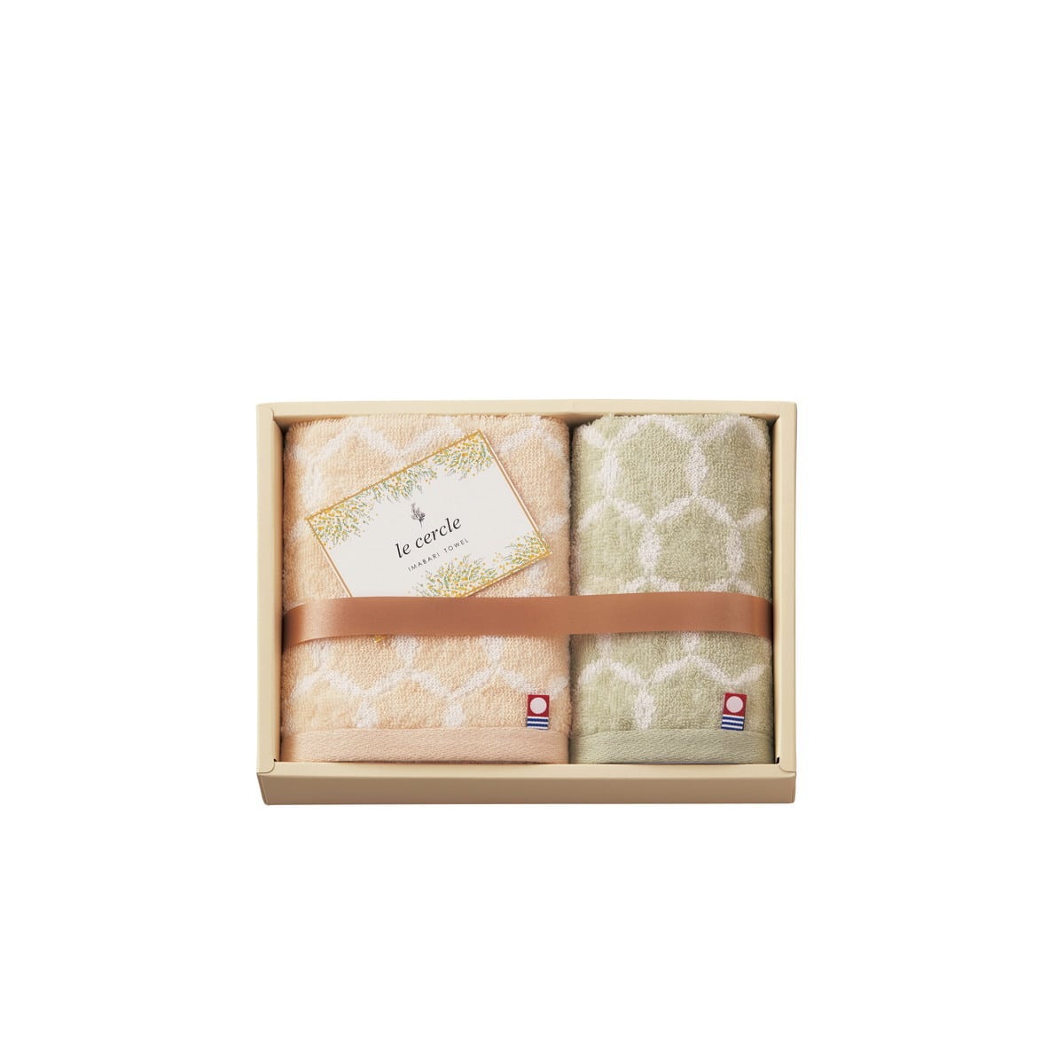 [ル・セルクル 今治産タオルセット LC4118] シリーズ名「ル・セルクル」の“セルクル”は、フランス語で「円(サークル)」を意味します。「円(えん)」をくり返したデザインのタオルに人とのつながり、「縁(えん)」が末永く続きますように…という想いを込めました。
