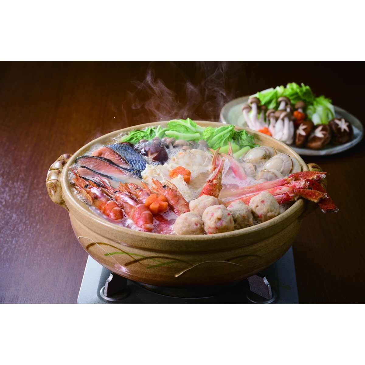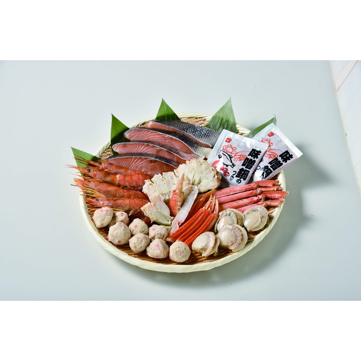 ●数量・内容:ボイルずわいがにハーフポーション(カナダ又はグリーンランド産)/300g、ボイルほたて(北海道産)/4玉、赤えび(アルゼンチン産)/4尾、かにつみれ/8個、秋鮭切身(北海道産)/40g×4切、味噌タレ/50g×2