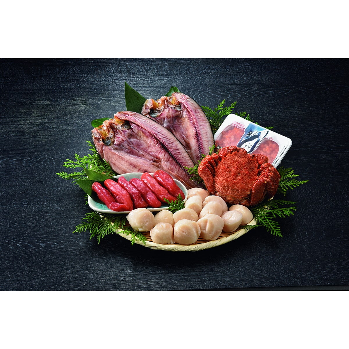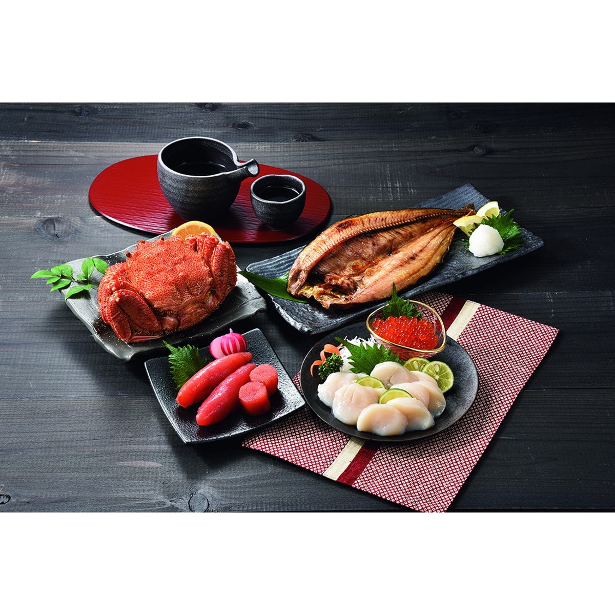●数量・内容:北海道産毛がに/350g、北海道産真ほっけ/250g×2、北海道産いくら醤油味/100g、北海道産帆立貝柱/200g、北海道産たらこ/200g