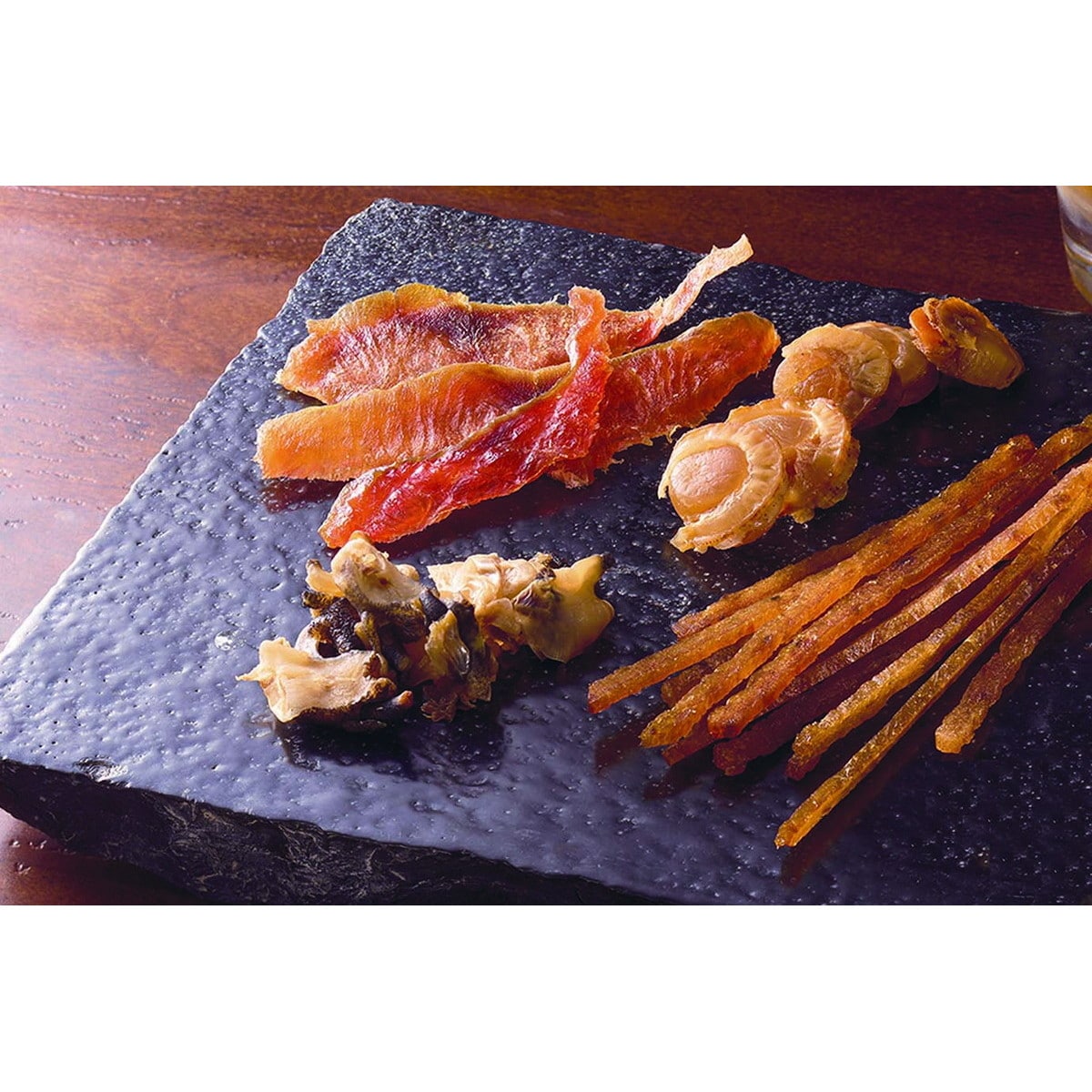 ●数量・内容:鮭とばイチロ/15g、浜焼ほたて・浜焼つぶ貝/各20g、炙りチーズいか/18g、ほっけ燻製スティック/35g、かに太郎/30g