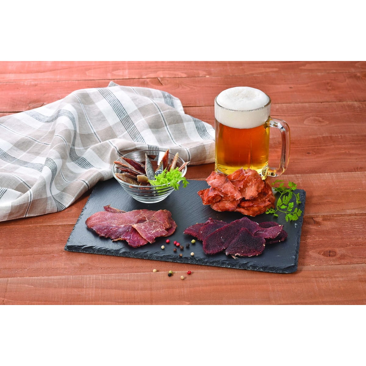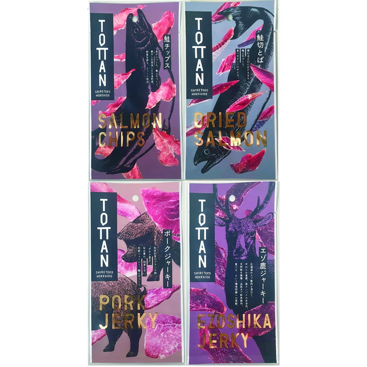 ●数量・内容:エゾ鹿ジャーキー/25g、ポークジャーキー/28g、鮭切とば/38g、鮭チップス33g