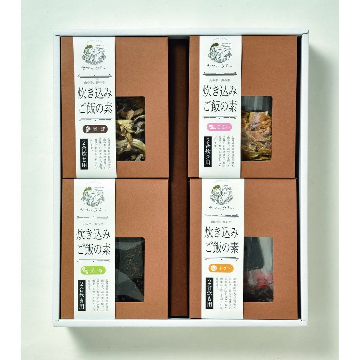 「ヤマヘウミヘ 北海道炊き込みご飯ギフトセット」 自宅で簡単に作れる炊き込みご飯の素です。北海道産の氷下魚、舞茸、帆立、昆布を使用し、食欲のそそられる香り豊かな素材とそのエキスが染み込んだご飯をお召し上がりいただけます。上品で奥深い逸品を是非お愉しみ下さい。