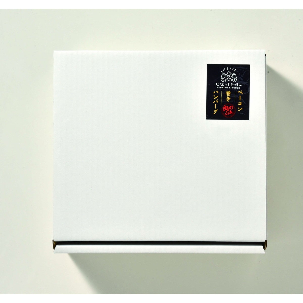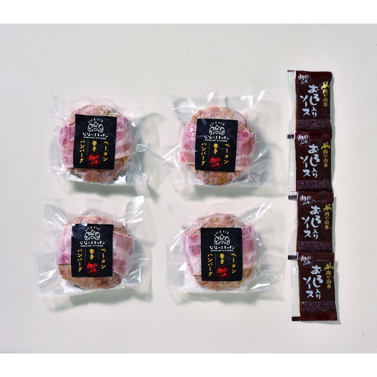 「肉の山本×なないろキッチン ベーコン巻ハンバーグ4個セット」 北海道産の豚肉と鶏肉を使用した、オリジナルハンバーグにベーコンを巻きつけたハンバーグです。ポーク&チキンのサッパリしたハンバーグにベーコンの旨味と香りがプラスされた逸品です。 添付のオリジナルおろしソースでお召し上がりください。