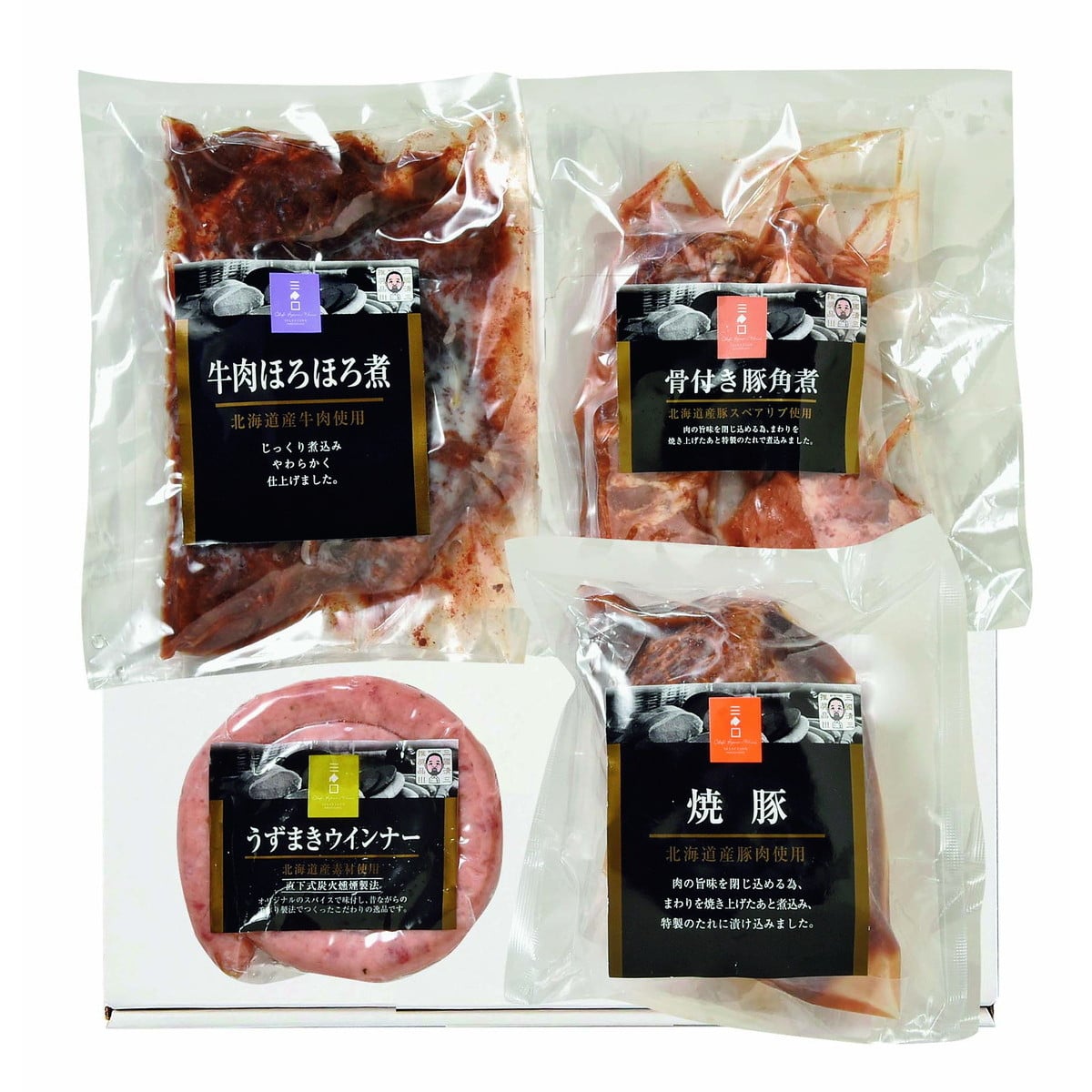 ●数量・内容:三國推奨牛肉ほろほろ煮/220g、三國推奨焼豚/270g、三國推奨骨付き豚角煮/190g、三國推奨うずまきウインナー/120g
