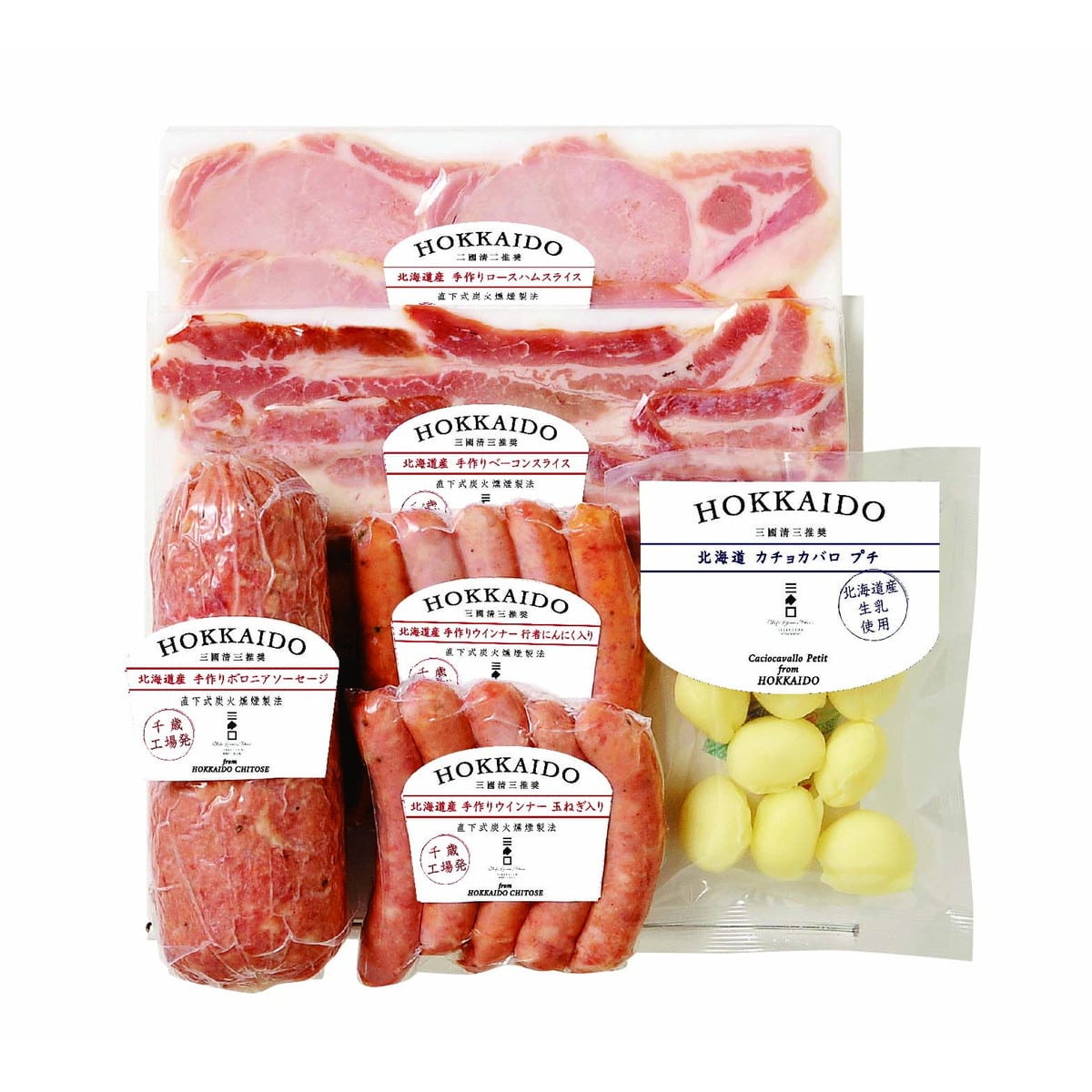 ●数量・内容:三國推奨北海道産手作りウインナー(玉ねぎ入り・行者にんにく入り)/各110g、三國推奨北海道産手作りベーコンスライス/70g、三國推奨北海道産手作りロースハムスライス/80g、三國推奨北海道産手作りボロニアソーセージ/400g、三國推奨北海道カチョカバロプチ/88g