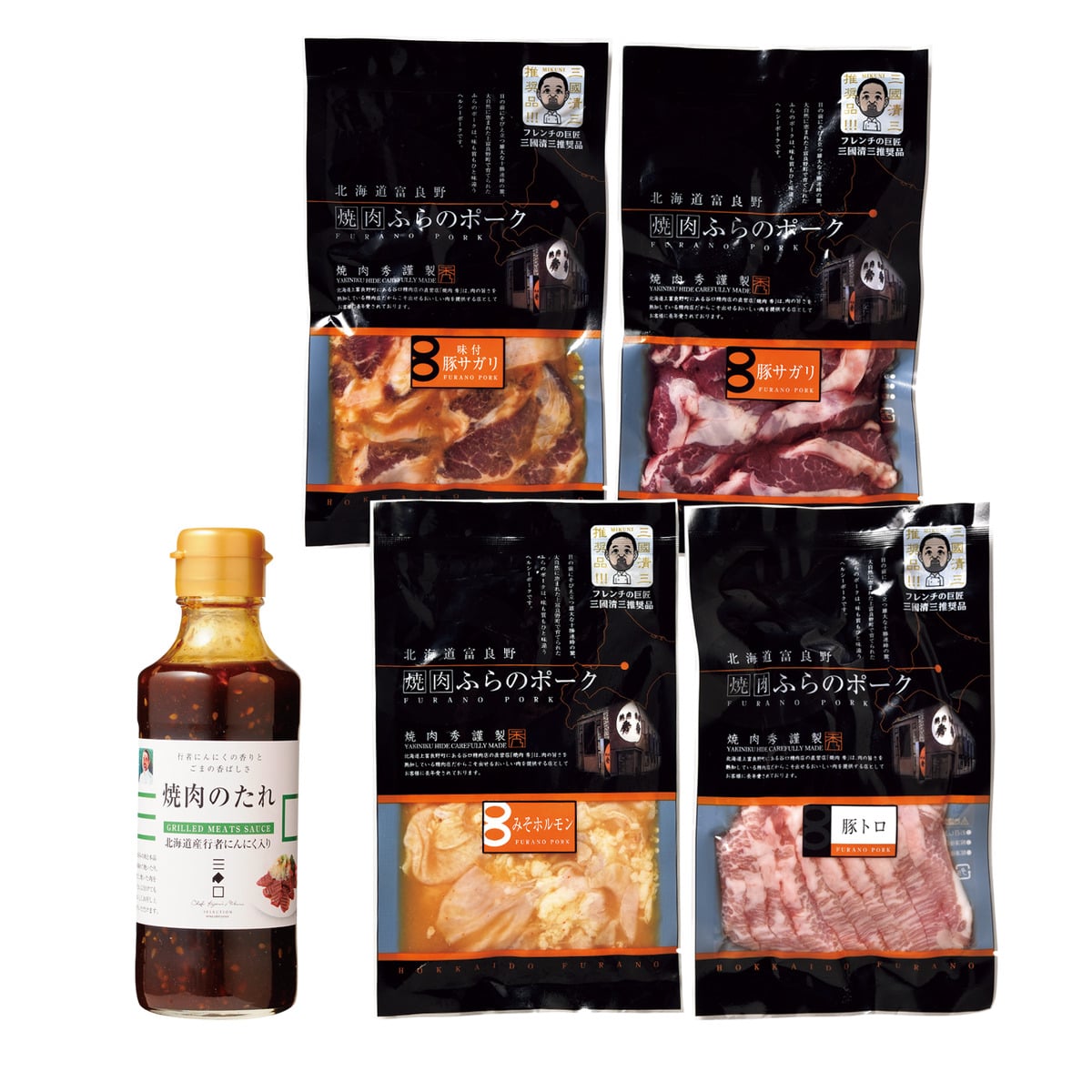 「三國推奨 焼肉セット・三國監修 焼肉のたれ付」 やわらかくてジューシーな「かみふらのポーク」上富良野町でのびのびと健康に育った「かみふらのポーク」。天然飼料を与えることで、肉質の良いジューシーな味わいになりました。三國シェフ監修の焼肉のたれとセットでお楽しみいただけます。