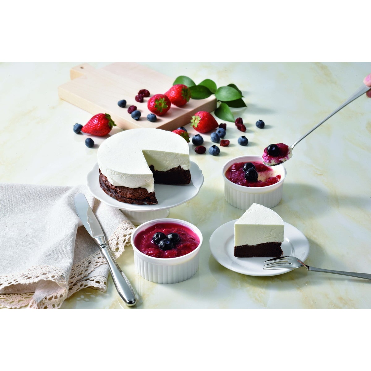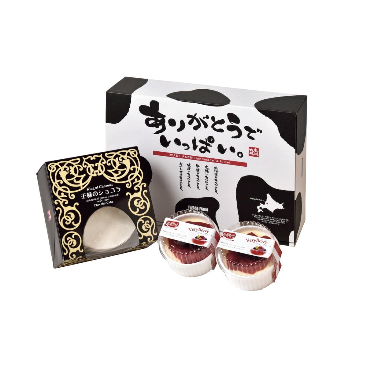 「岩瀬牧場 王様のショコラ&ベリーレアチーズセット」 芳醇な香りの濃厚なガトーショコラとふんわりとろけるクリームの2層のケーキの「王様のショコラ」とフルーティーで爽やかなヨーグルトの酸味が効いた「ベリーベリーレアチーズケーキ」のセットです。