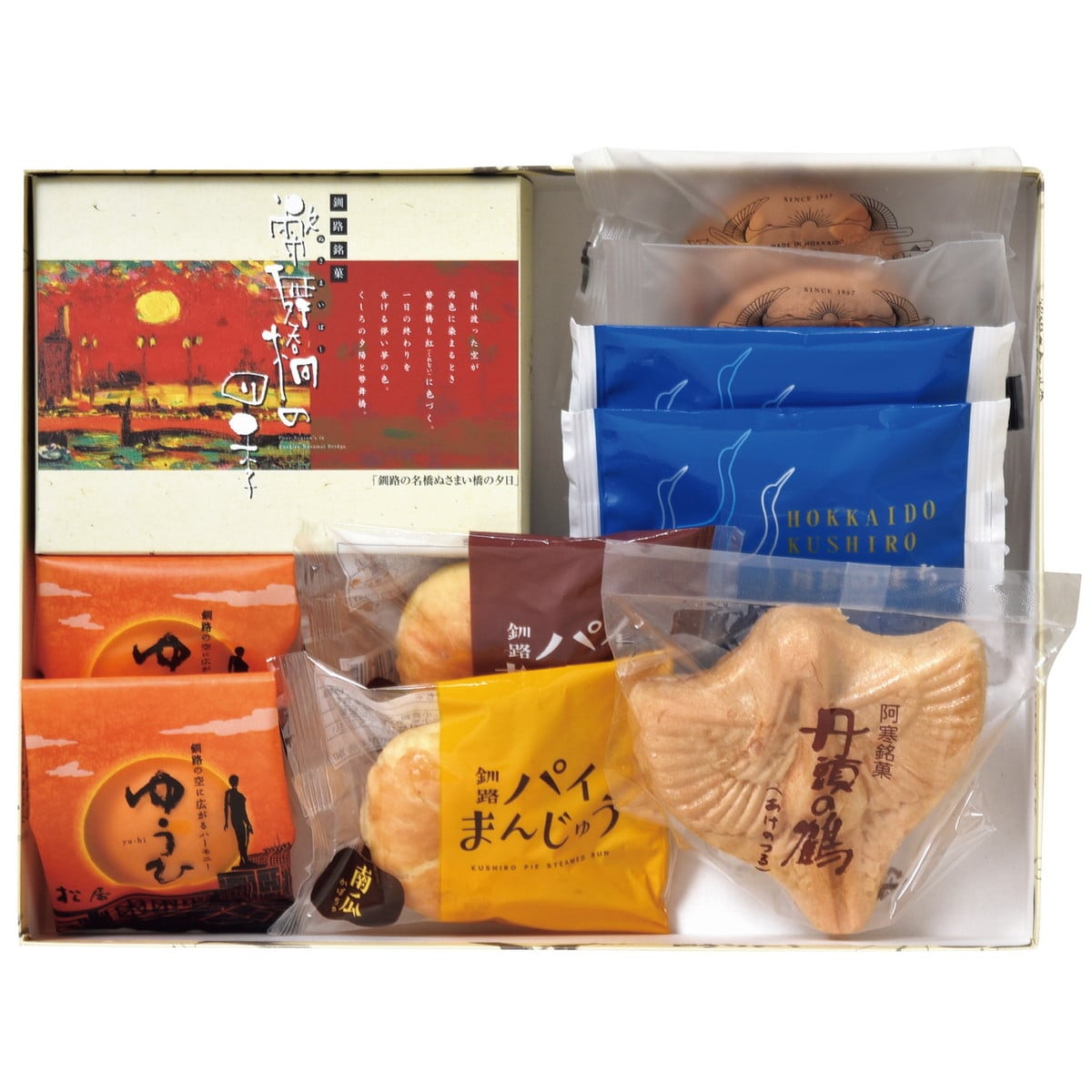 ●数量・内容:幣舞橋の四季(4枚入り)・丹頭の鶴・釧路パイまんじゅう(南瓜・小豆)/各1個、ゆうひ・丹頂のまち・釧路湿原紀行/各2個