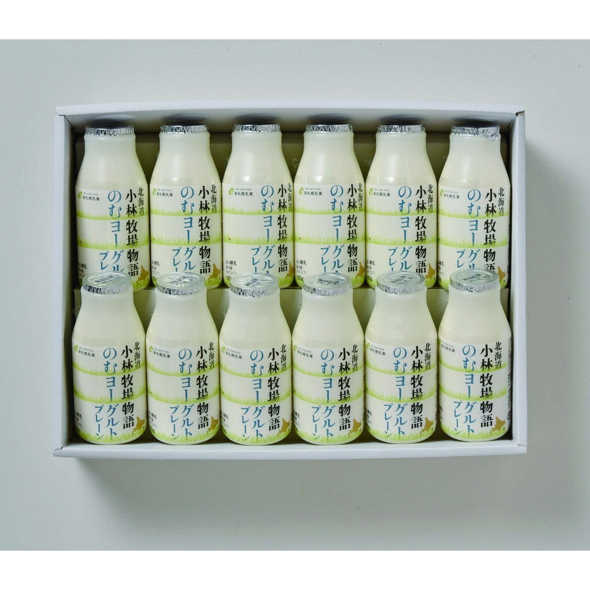 「新札幌乳業 北海道小林牧場物語のむヨーグルト12本セット」 北海道江別市の小林牧場でとれた生乳を100%使用し、独自製法で適度なとろみ・酸味・芳香を引き出した濃厚なのむヨーグルト。