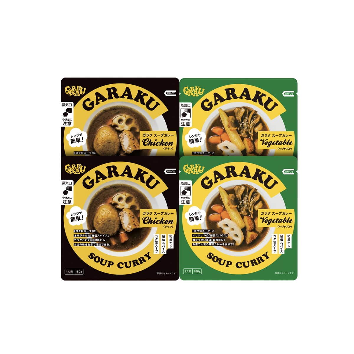 「GARAKU レトルトスープカレー詰合せ4個入」 レンジで簡単!札幌の人気店「GARAKU」の和風ダシと秘伝スパイスが効いたコク旨スープカレー。鶏もも肉と3種野菜が入った「チキン」と、5種野菜が入った「ベジタブル」の2種類を詰合せました。