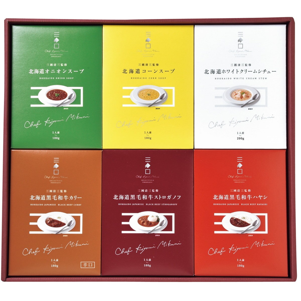 ●数量・内容:三國監修北海道黒毛和牛カリー・三國監修北海道黒毛和牛ストロガノフ・三國監修北海道黒毛和牛ハヤシ・三國監修北海道コーンスープ・三國監修北海道オニオンスープ/各180g、三國監修北海道ホワイトクリームシチュー/200g