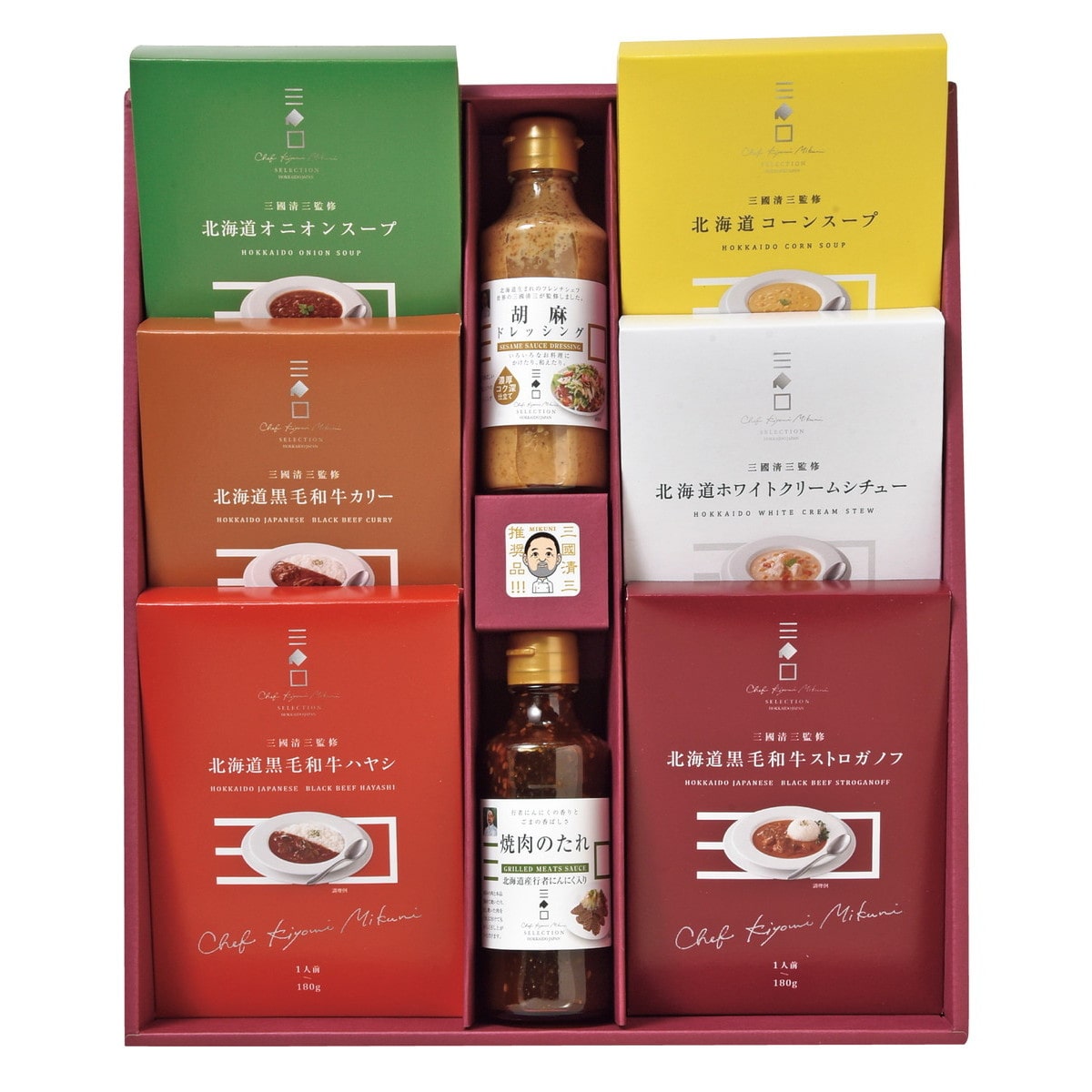 ●数量・内容:三國監修北海道黒毛和牛カリー・三國監修北海道黒毛和牛ストロガノフ・三國監修北海道黒毛和牛ハヤシ・三國監修北海道コーンスープ・三國監修北海道オニオンスープ/各180g、三國監修北海道ホワイトクリームシチュー/200g、三國監修胡麻ドレッシング/195ml、三國監修焼肉のたれ 行者にんにく入り/193ml