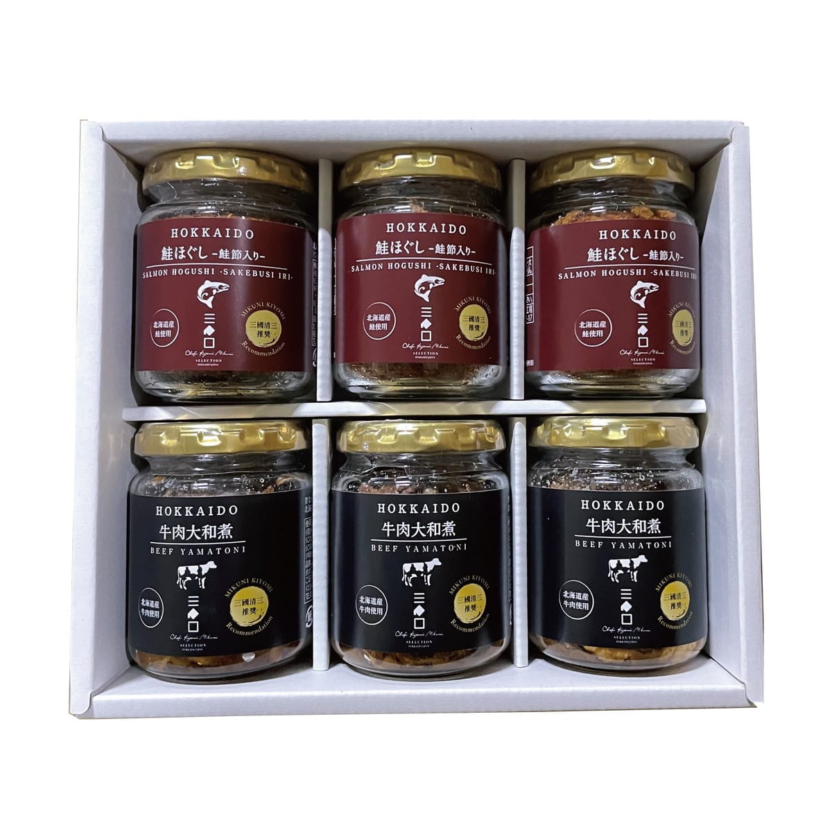 ●数量・内容:三國推奨北海道鮭ほぐし-鮭節入り-/70g×3、三國推奨北海道牛肉大和煮/90g×3