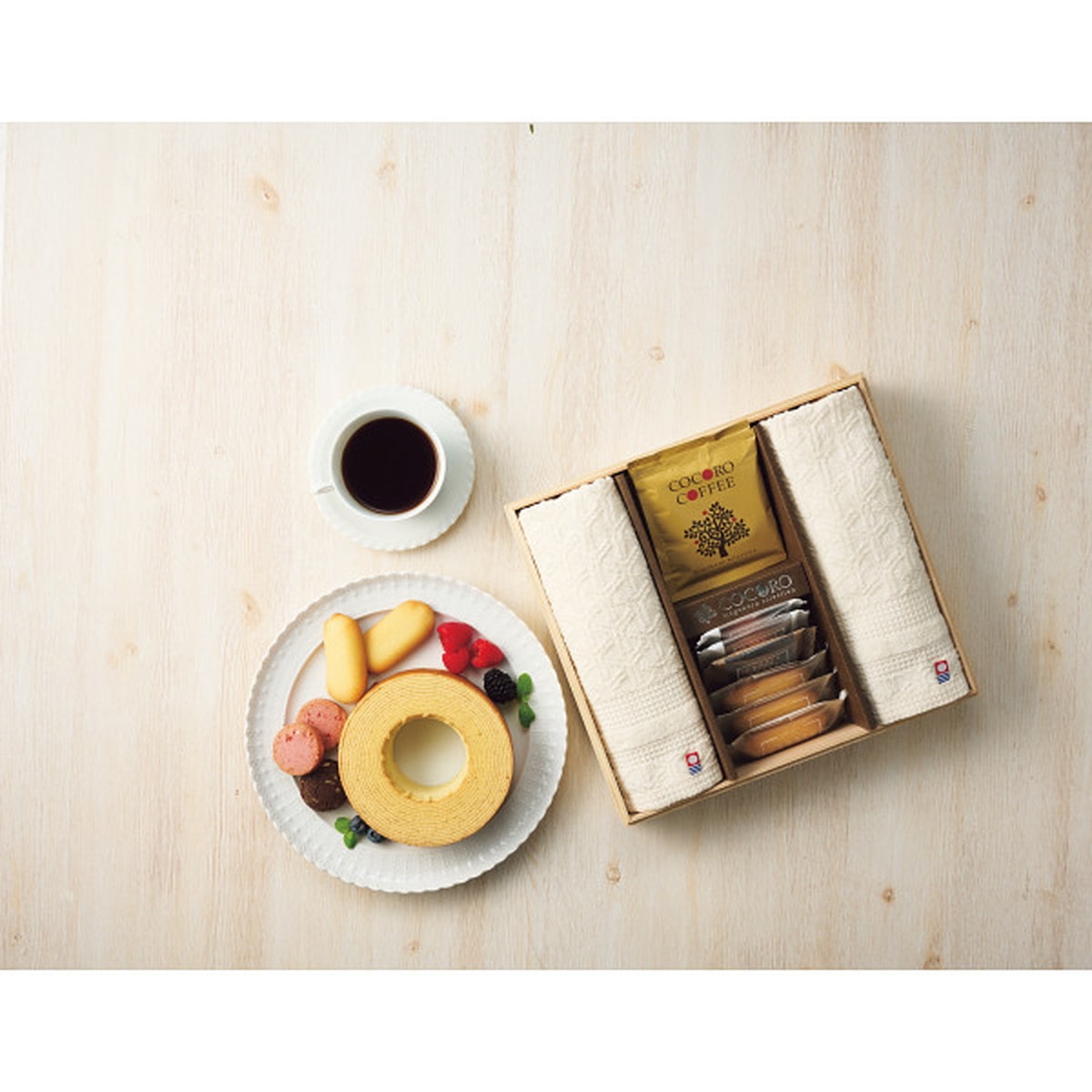 「ココロ 今治タオル・スイーツセット(木箱入)」 やさしい口あたりと、やさしい肌ざわり。人気のスイーツと今治タオルをセットで。