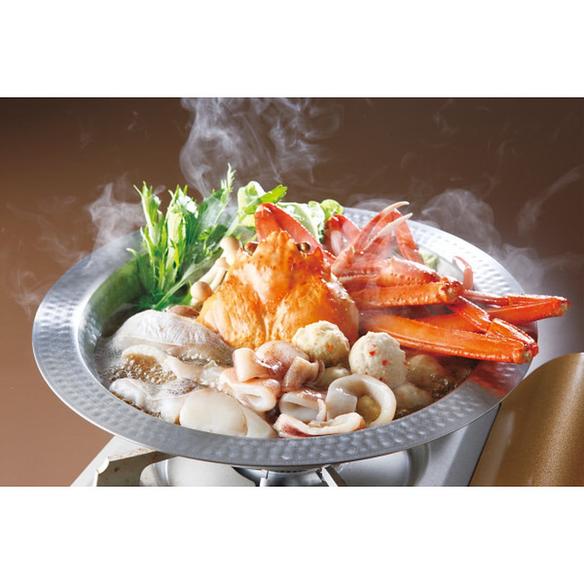 「紅ズワイまるごと海鮮鍋」 紅ずわいがにを丸ごと一尾入れた贅沢な海鮮鍋です!かにから出るダシは絶品!!自慢の甘えび魚醤油を使って風味を加えたオリジナルの醤油タレで海の幸たっぷりのお鍋をお楽しみください。