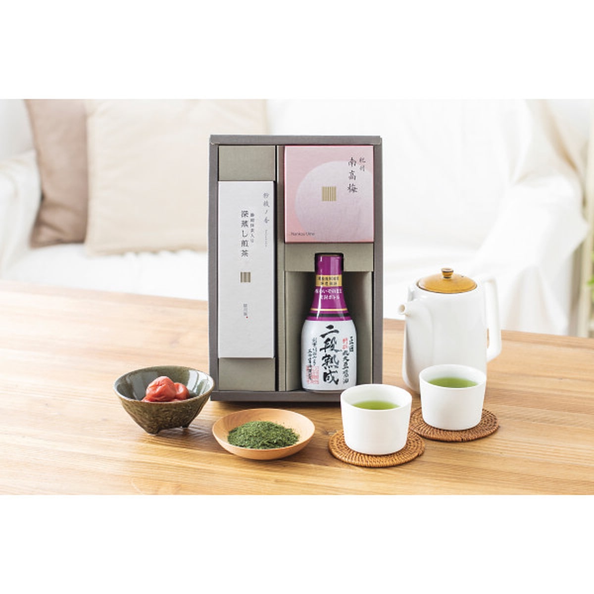 ●数量・内容:深蒸し煎茶 静岡抹茶入り65g、紀州南高梅70g、正田 特撰丸大豆醤油二段熟成200ml