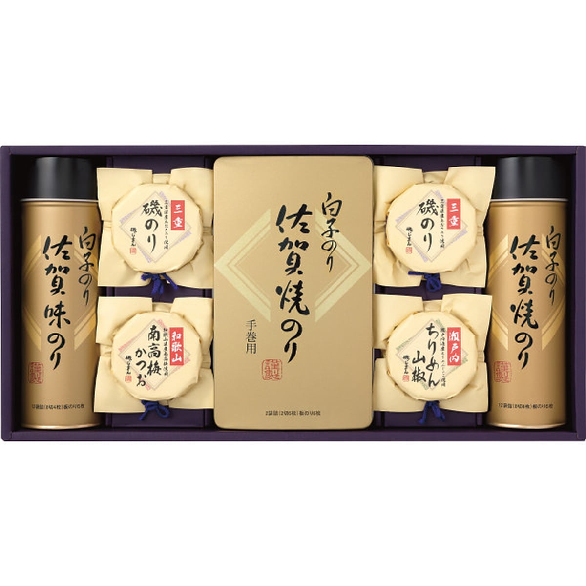 ●数量・内容:味のり12袋詰(8切4枚)・焼のり2袋詰(2切6枚)・焼のり12袋詰(8切4枚)・三重磯のり125g×2・瀬戸内ちりめん山椒50g・和歌山南高梅かつお125g