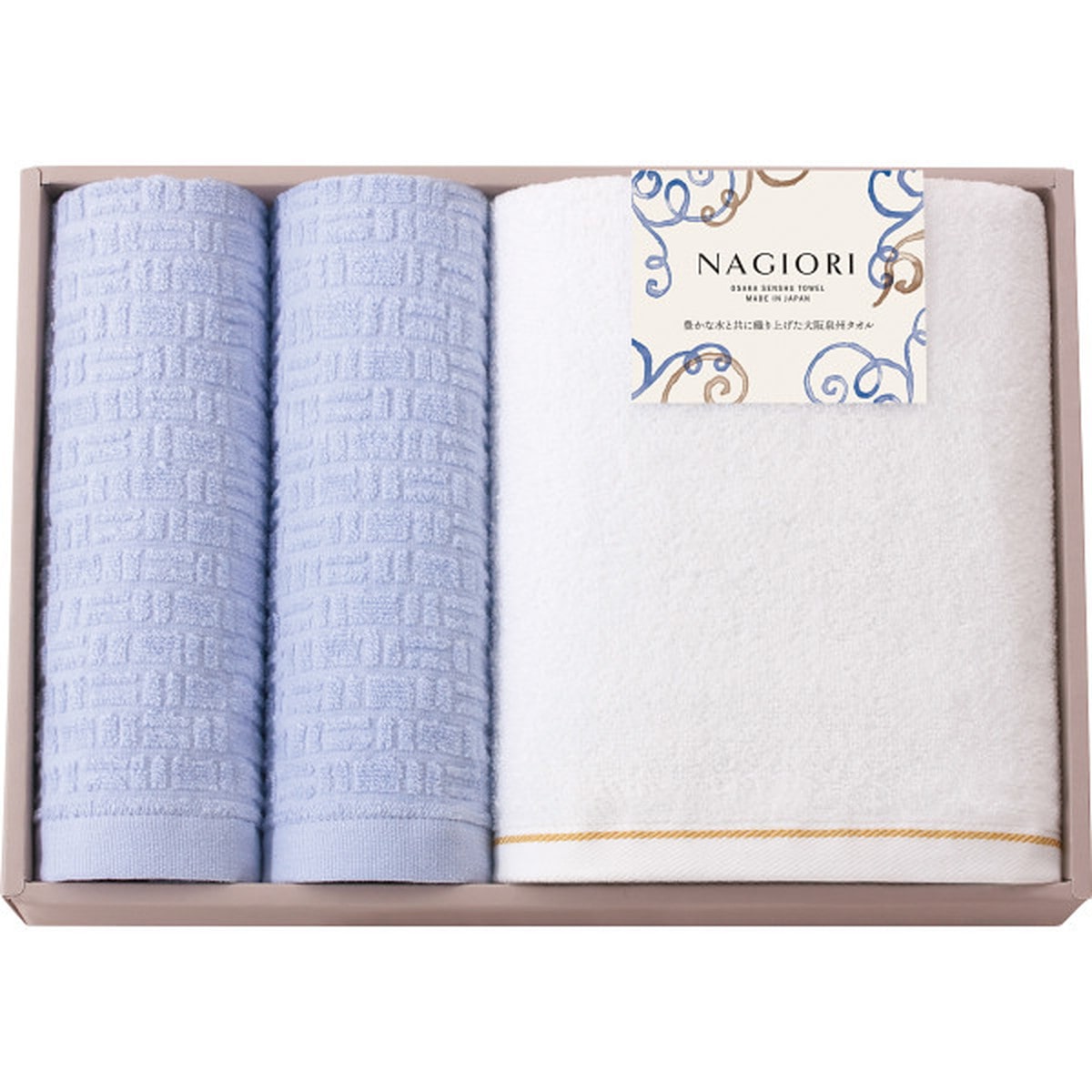 「NAGIORI 泉州バス・ハンドタオルセット」 空気を含んだ軽やかでやわらかな日本製タオル。和泉(いずみ)山脈から流れる豊富な水と共にタオルづくりが行われてきた大阪・泉州。特別な撚りを施した糸を使用した、毛羽落ちが少なく軽やかでやわらかな心地良いタオルです。