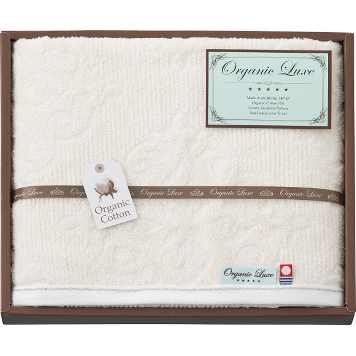 「オーガニックコットン使用 今治産 バスタオル」 人にも環境にもやさしいさを贈る、オーガニックコットンのタオル。パイル部分にオーガニックコットンを使用。優雅な文様のジャガード織が落ち着いた雰囲気を醸します。