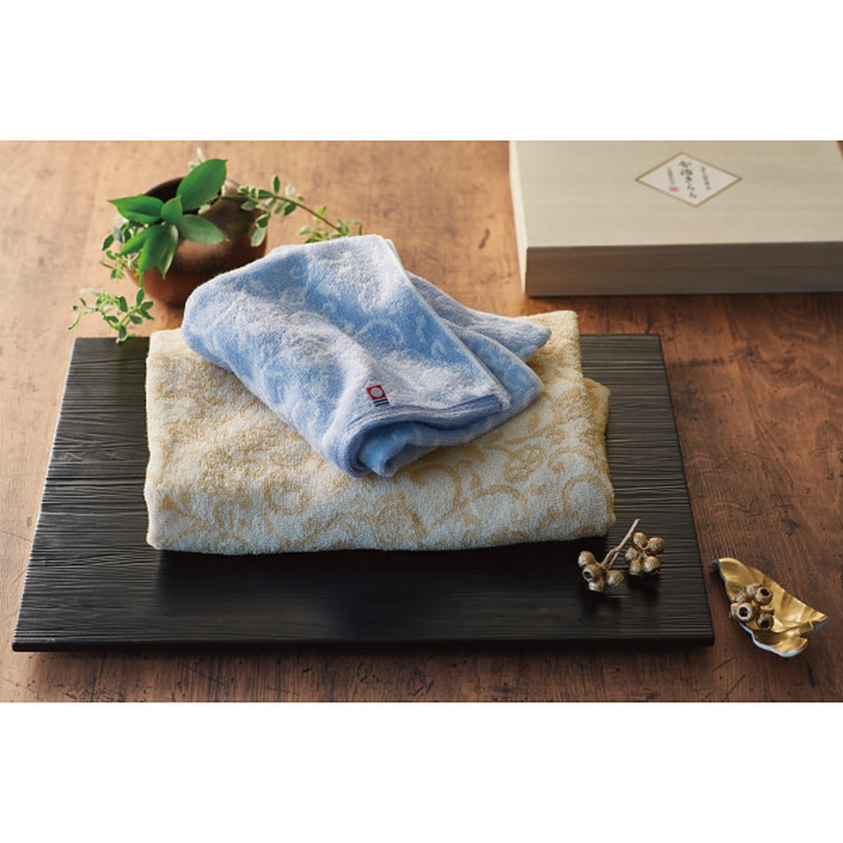 「今治きらら フェイス・ハンドタオルセット(木箱入)」 今治の自然を感じる色彩で丁寧に織り上げた情緒あふれる和更紗模様の今治タオル。美しい今治タオルを木箱に詰め合わせた丁寧な贈りものです。