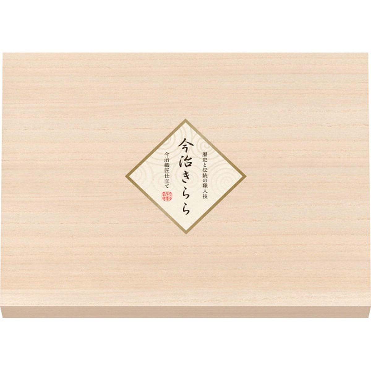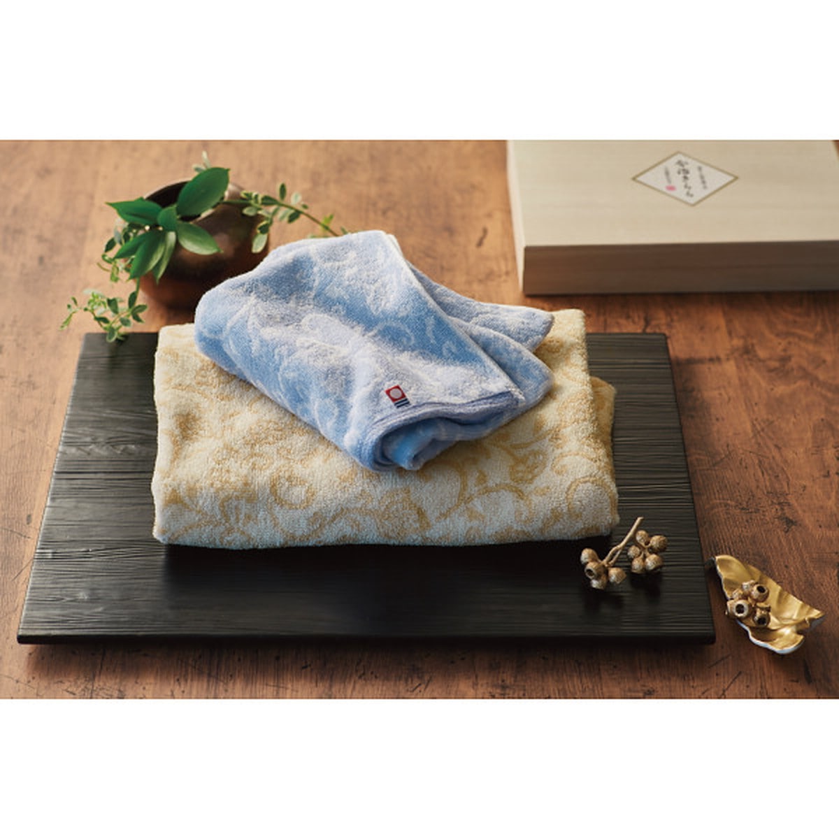 「今治きらら フェイスタオル2枚セット(木箱入)」 今治の自然を感じる色彩で丁寧に織り上げた情緒あふれる和更紗模様の今治タオル。美しい今治タオルを木箱に詰め合わせた丁寧な贈りものです。