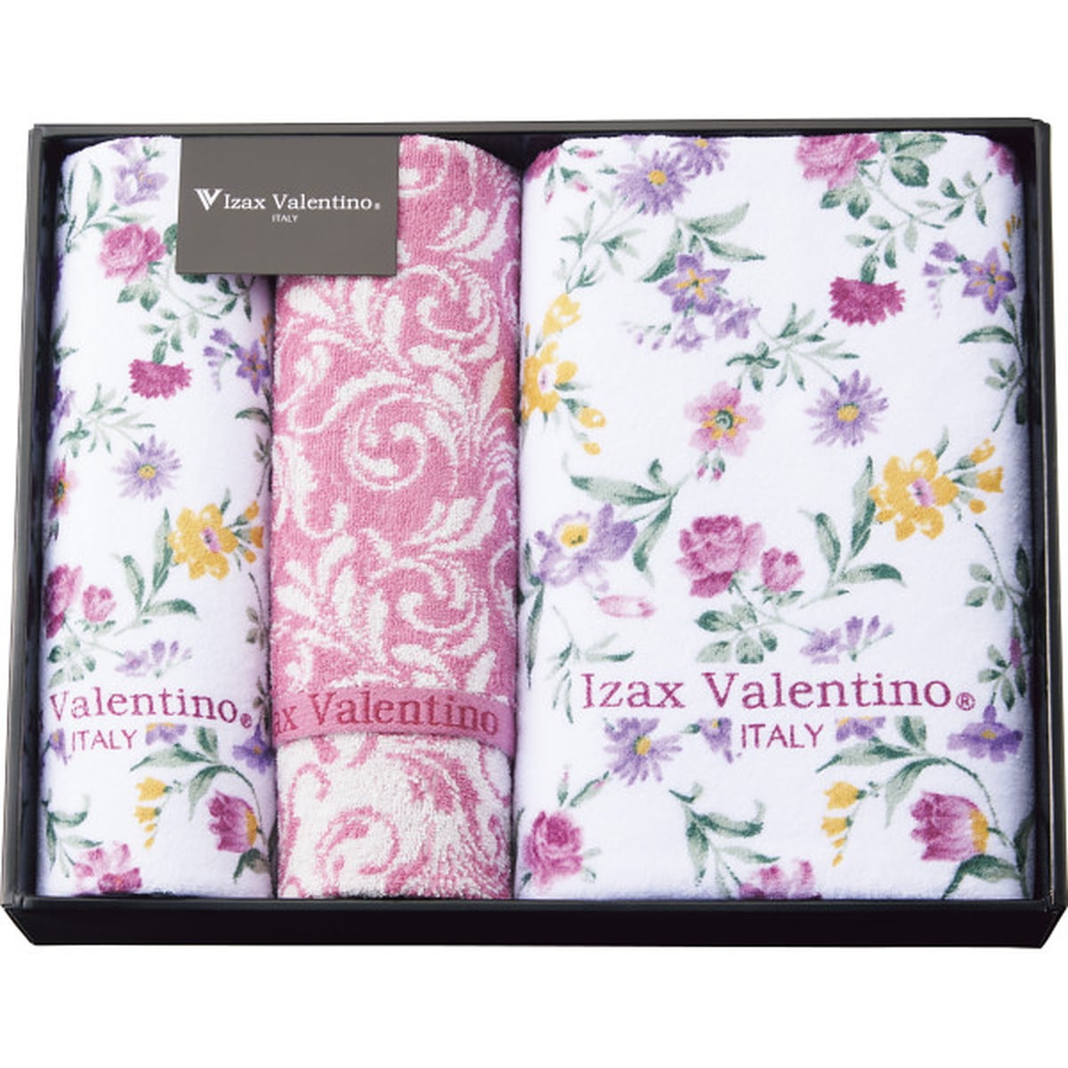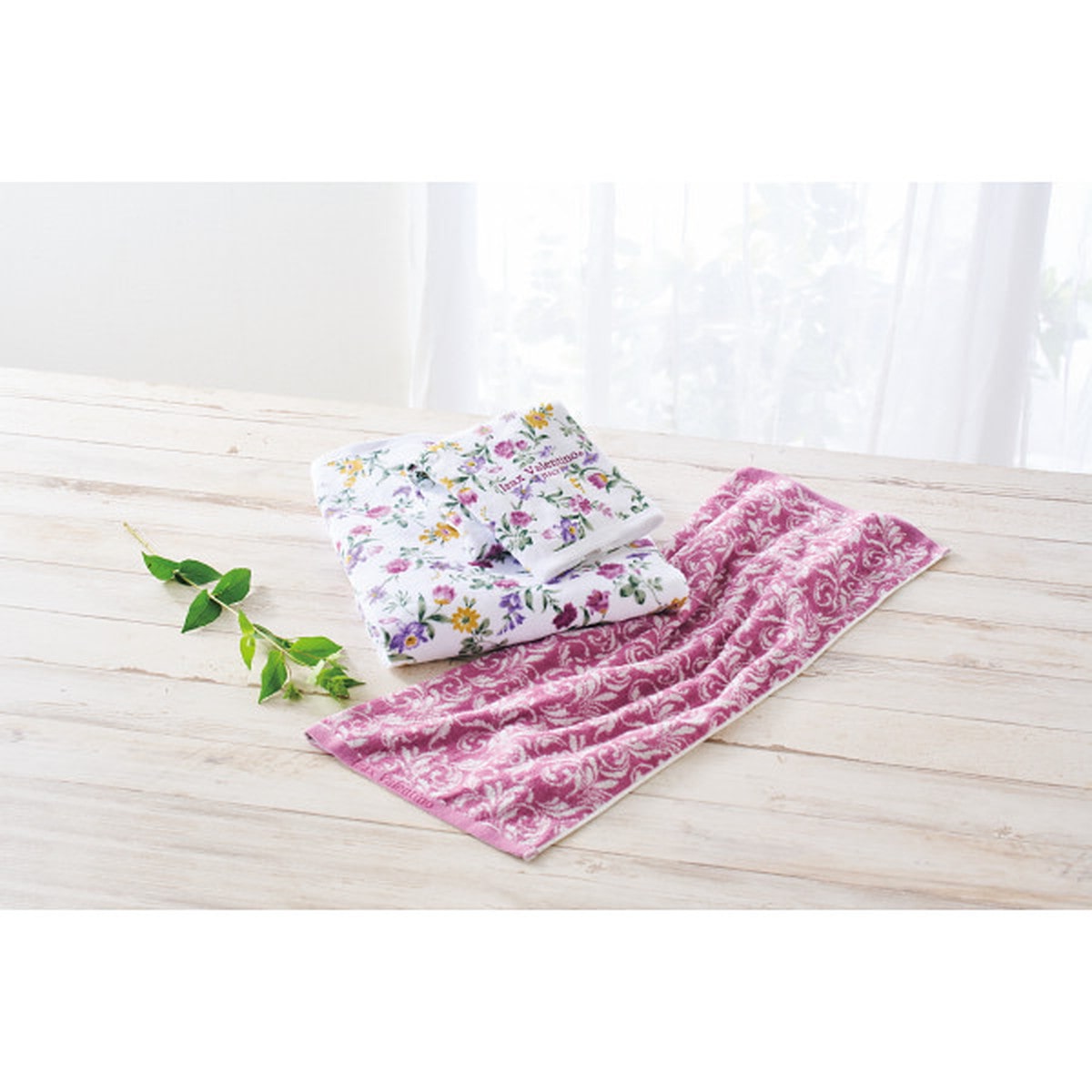 「アイザック・バレンチノ バス・フェイスタオルセット」 可憐なプリント柄のタオルとしっかりと織り上げたジャカードタオルのセットです。