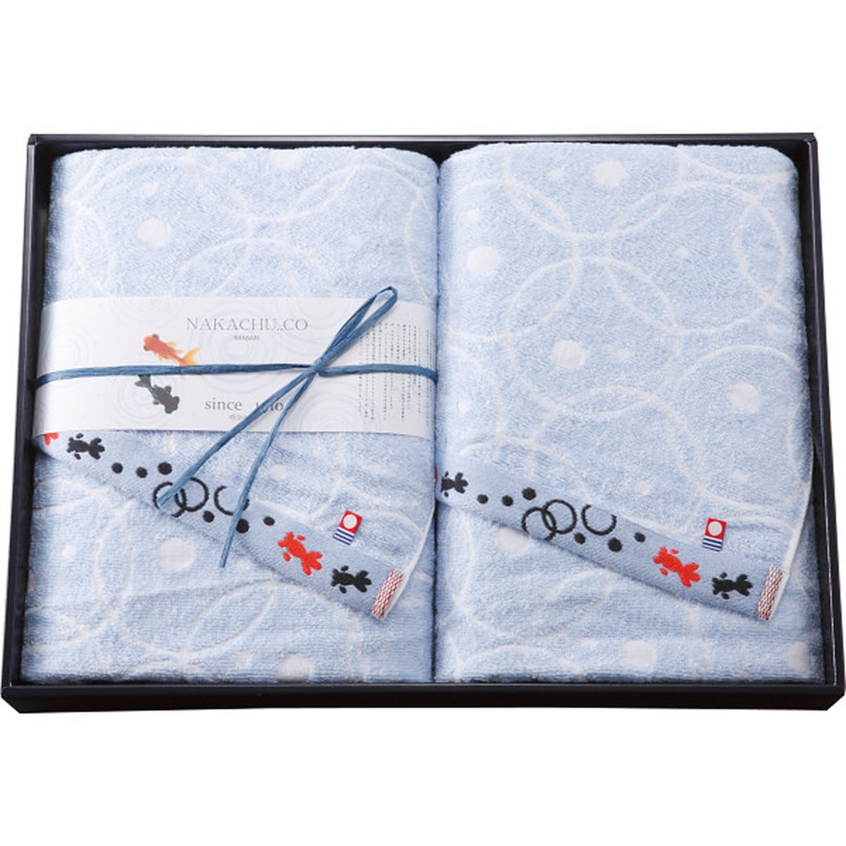 「中忠 今治産金魚タオル バスタオル2枚セット」 軽くて使いやしい片面ガーゼ織り。ワンポイントの金魚が可愛くておすすめです。