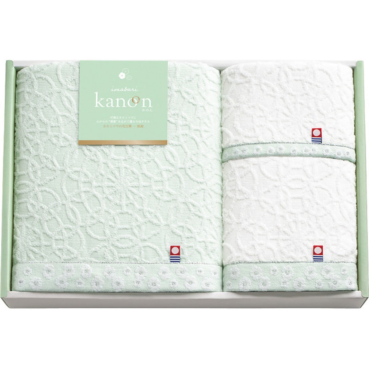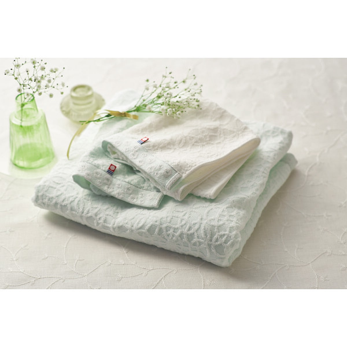 「今治かのん バス・フェイス・ハンドタオルセット」 やわらかな糸が奏でるカスミソウと今治タオルのやさしいハーモニ-。白くやさしい花を咲かせるカスミソウモチ-フのふんわりとやさしい今治タオルです。