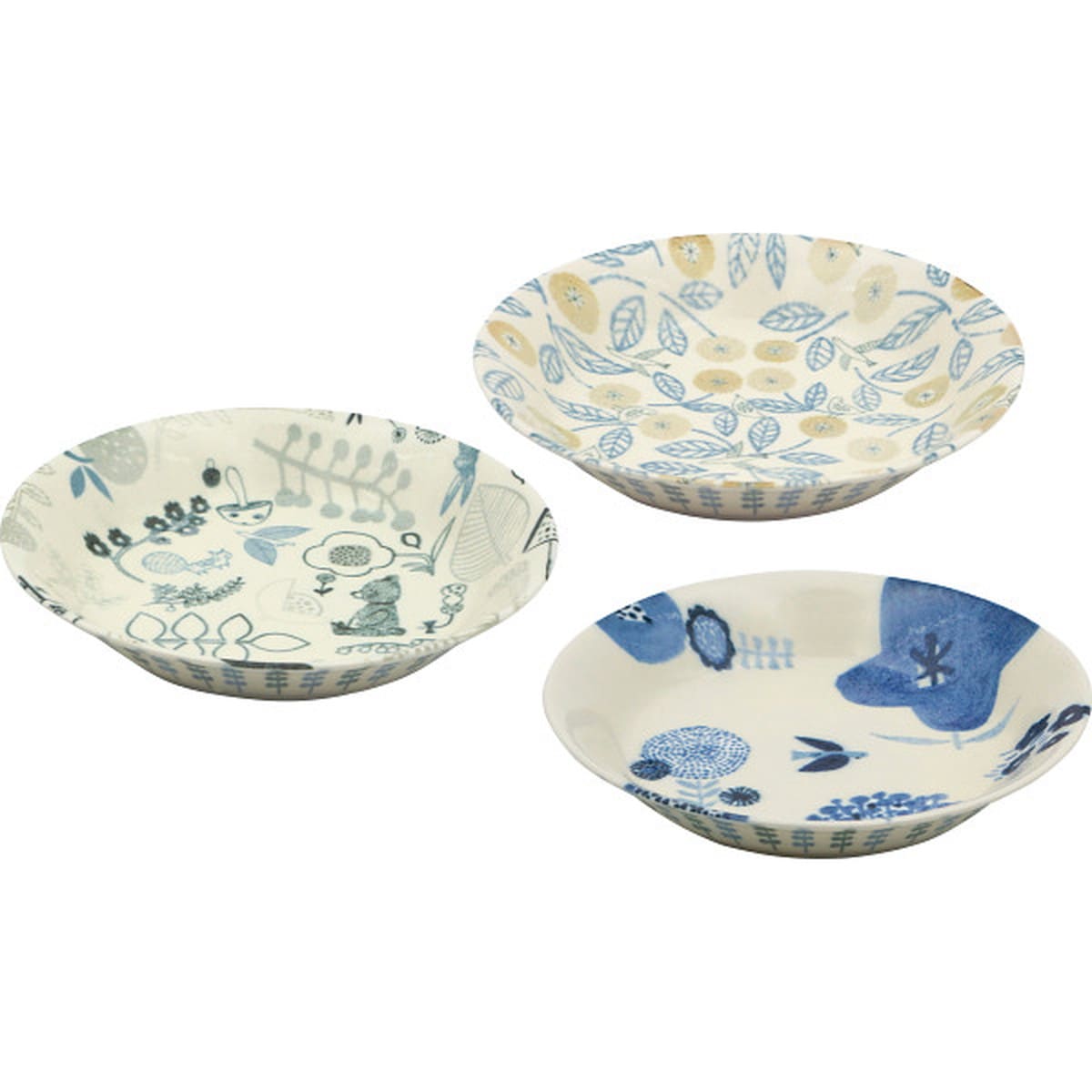 「ひなた暮らし カレーパスタ皿3枚セット」 柔らかい生成り色の生地に描かれた愛らしい生き物や花たちはまるで日向ぼっこをしているようなぽかぽか優しい気持ちになれます。裏面にもリーフ柄を施しました。