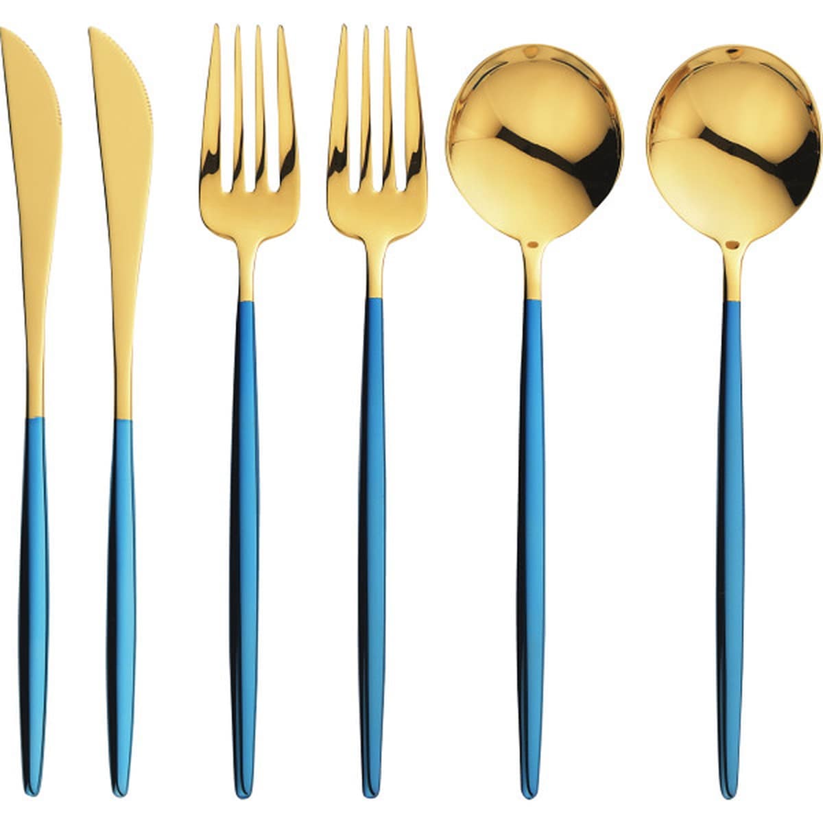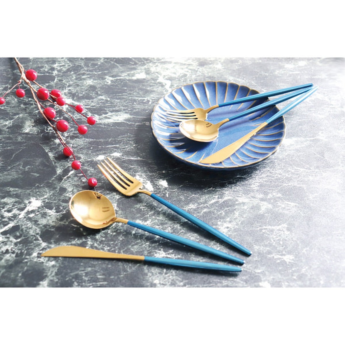 「ポルト デザート6本セット(金メッキ)」 煌びやかな金色の本体と、ブルーの柄が印象的。デザイン性が高くお祝い事にもピッタリ。シンプルな食器と合わせたり、華やかな金縁のプレートで揃えても◎。空のブルーや常夏のビーチを想わせるリゾート感も好印象。