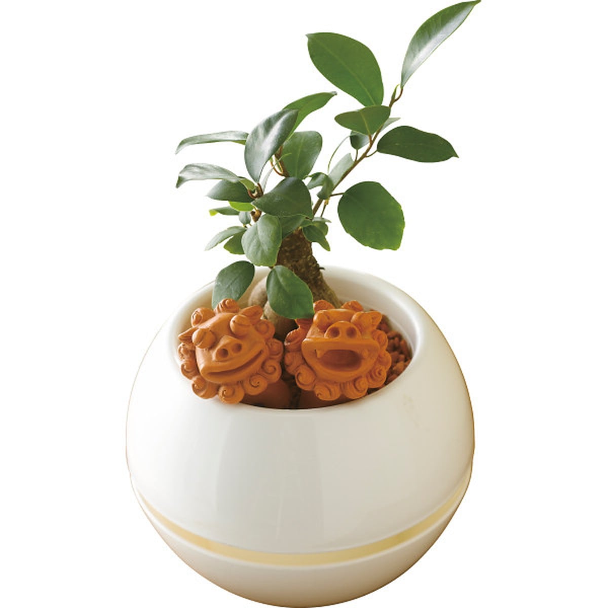 「ガジュマル シーサー 丸鉢5号鉢」 ガジュマルとシーサー像をセットした室内観葉です。やや肉厚で光沢のある葉と、独特な姿で人気のガジュマルです。沖縄で魔除けとされるシーサー像を添えてお届けします。