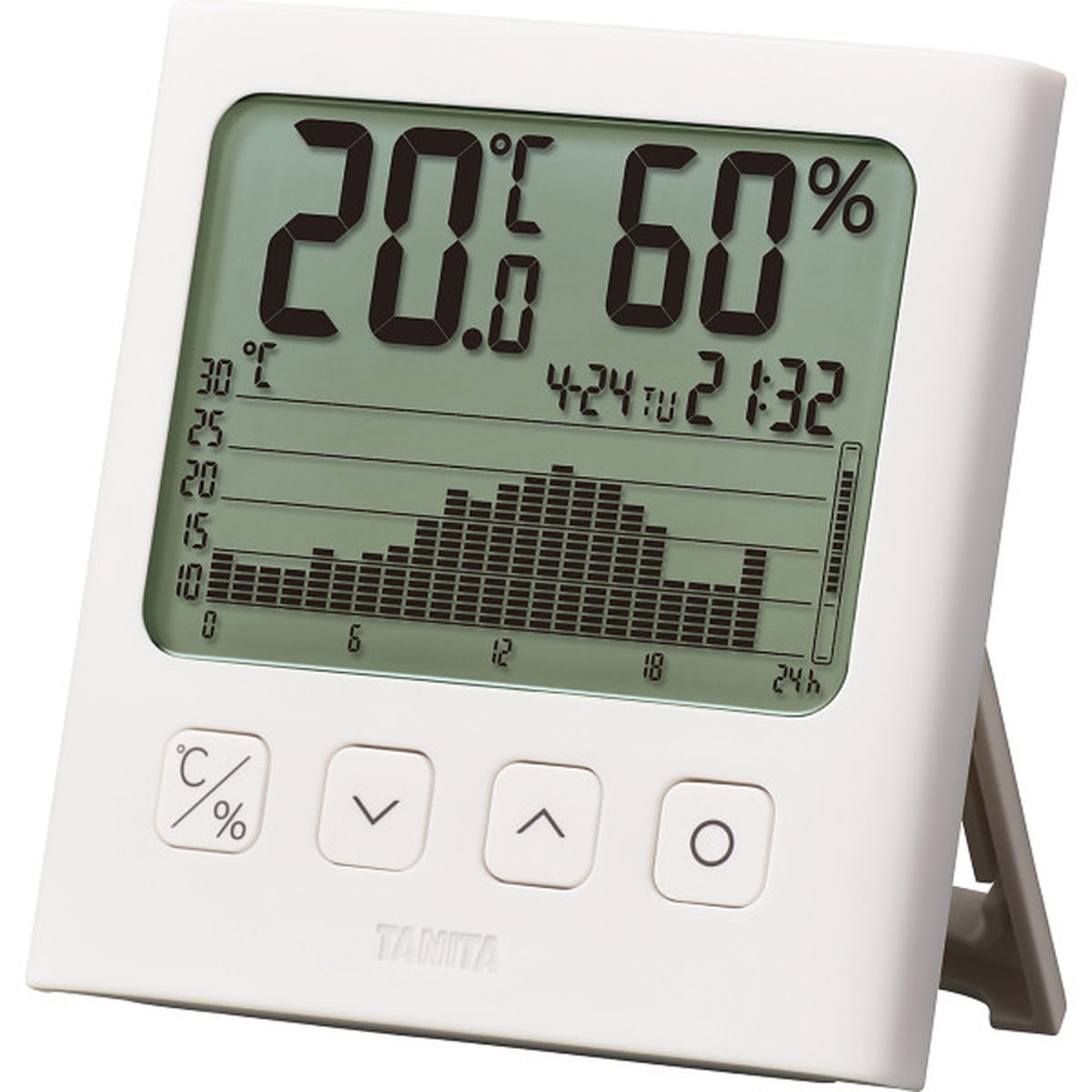 「タニタ グラフ付きデジタル温湿度計」 オートフィット機能で24時間の温湿度変化を見逃がさない。1日の温湿度変化に合わせて、グラフを自動でみやすく調整。変化が小さな日でも大きな日でも、一目で確認できます。当日を含む、14日間のメモリー機能。記録されているすべての温湿度の変化にあわせてグラフを自動調整。同じ温度/湿度幅で日々の変化を確認できます。設定した快適範囲の同時表示で、理想の環境づくりをサポートします。