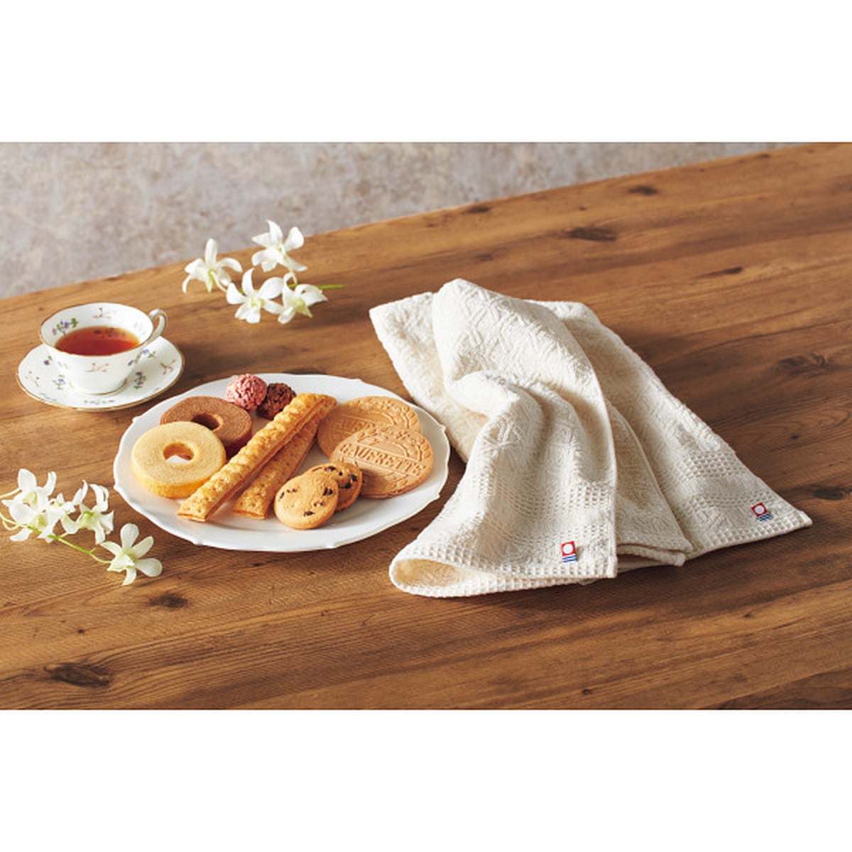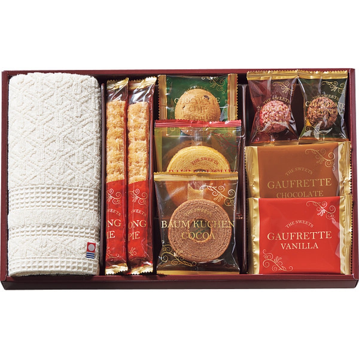 ●数量・内容:チョコチップクッキー×1・ロングスティックパイ×2・バウムクーヘン(ココア)×1・バウムクーヘン(バニラ)×1・ゴーフレット(チョコ)×1・ゴーフレット(バニラ)×1・チョコレートクランチ(ミルク)×1・チョコレートクランチ(ストロベリー)×1・ウォッシュタオル(約34×35cm・綿100%・日本製)×1