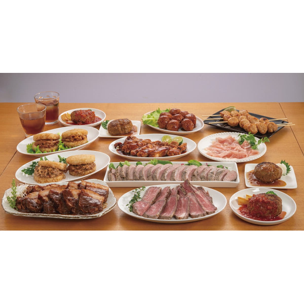 ●数量・内容:王様のローストビーフ200g×1、ハンバーグ(牛肉・豚肉使用)130g×4、和風シャリアピンソース40g×2、トマトイタリアンソース40g×2、豚ひれ肉のやわらかローストポーク360g×1、黒酢たれ肉だんご300g×1、つくね串210g(6本)×1、豚肉の味噌煮込み450g×1、ロース生ハム67g×1、若鶏の黒酢たれ300g×1、ライスバーガー牛カルビ260g(2個)×1、ライスバーガー豚生姜260g(2個)×1