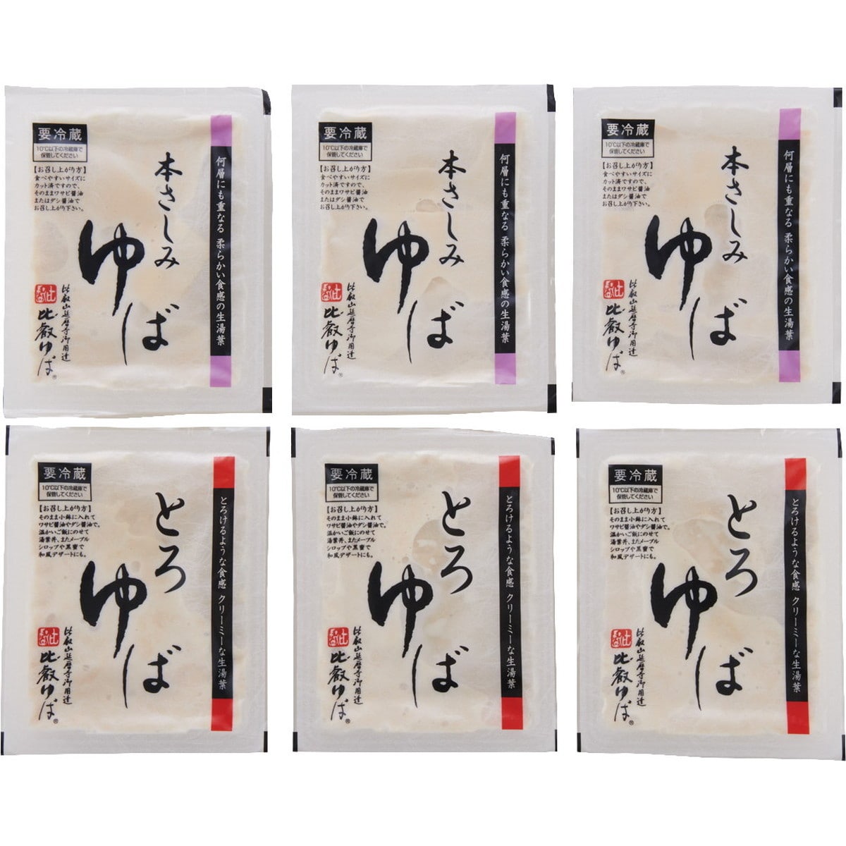 [滋賀「比叡ゆば本舗ゆば八」生ゆば詰合せ] クリーミーなとろゆばは、卵かけご飯にもおすすめ。ミルフィーユ状の本さしみゆばは、わさび醤油でどうぞ。