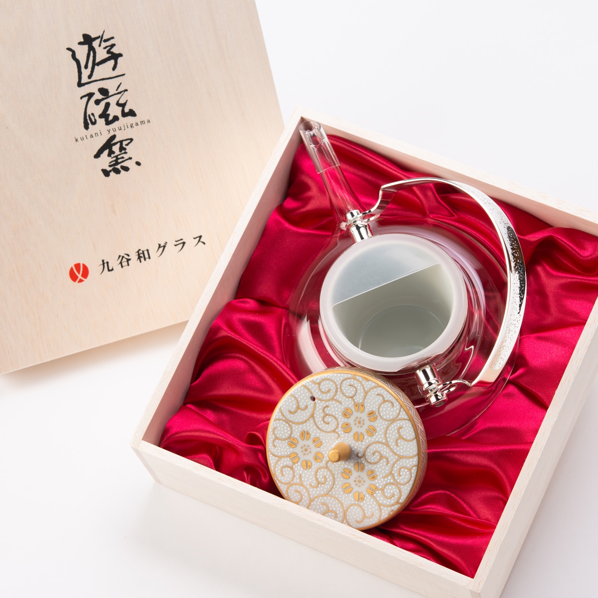 色鮮やかな絵付けに目を奪われる石川県が誇る「九谷焼」と手作りの吹き硝子の融合商品「九谷和グラス」シリーズの『九谷ちろり 白粒鉄仙』です。絵柄は大正時代に広まった「白粒鉄仙(しろちぶてっせん)」。金彩で鉄仙の花や弦に見立てたモチーフを描き、その隙間を細点で埋める独特の彩色が特徴です。絵付けはすべて職人の手作業にて絵付けされており、ちろりのガラス器もひとつひとつ手作りされております。九谷焼の絵付けが施された器を取り出しその中に氷を入れて、キリリと冷やしたお酒を入れてお楽しみください。入れたお酒が九谷焼の絵柄を大きく見せる効果があり、好奇心と遊び心をくすぐります。高級感のある専用木箱に入れてお届けしますのでプレゼントにも最適です。