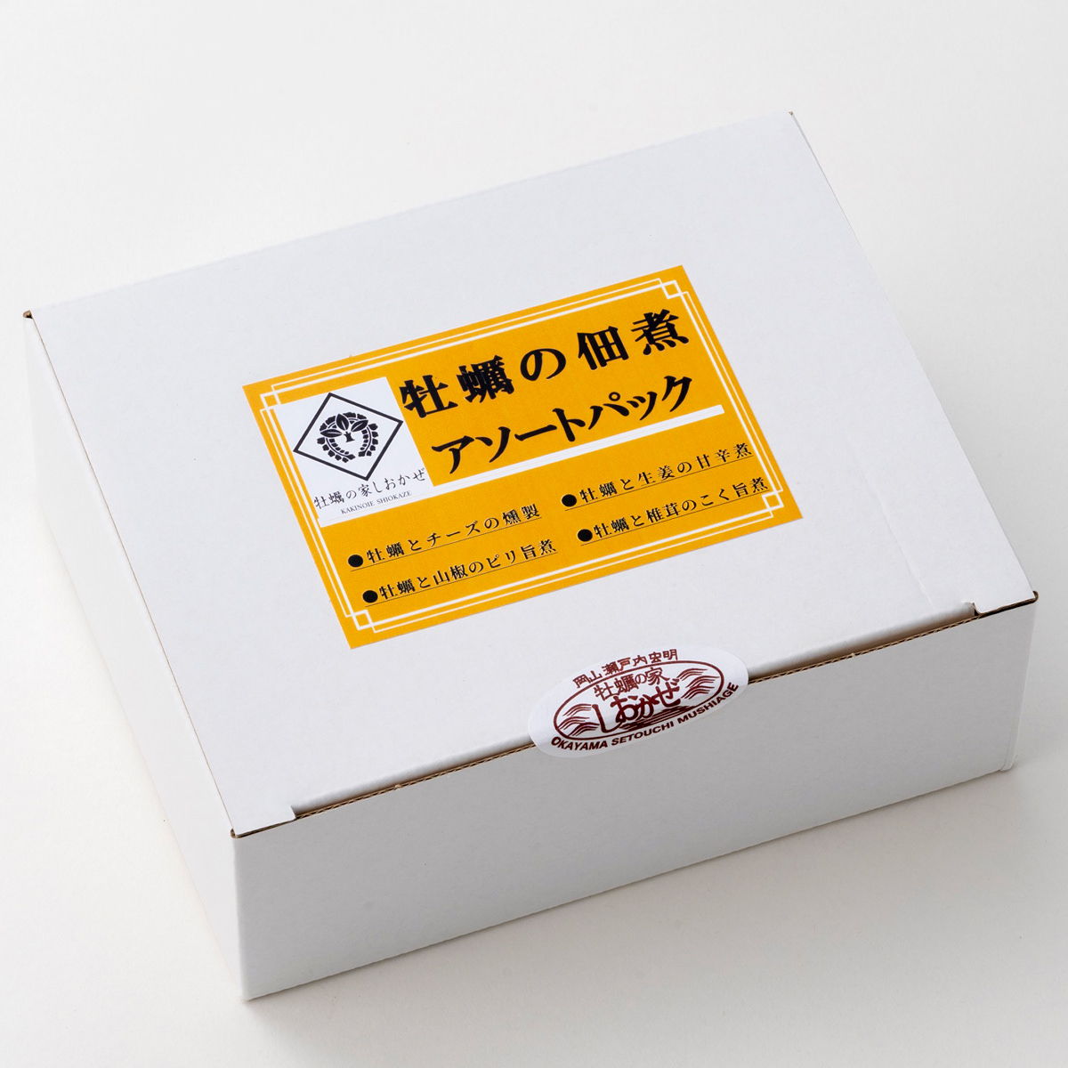 「牡蠣の家しおかぜ 牡蠣の佃煮 ギフトセット」は、岡山県瀬戸内市産の牡蠣を使用した、牡蠣漁師の昔ながらの佃煮と燻製の詰め合わせです。ご飯のお供、食卓のおかず、お酒のお供、おつまみなどとして、お取り寄せでお楽しみください。<かきっこと生姜のあま辛煮>しおかぜの女将に代々引き継がれてきた伝統の味。生姜を加えて甘辛く仕上げました。<かきっこと山椒のピリ旨煮>爽やかな山椒のピリっとした風味が牡蠣の旨味を引き立てます。<かきっこと椎茸のこく旨煮>牡蠣の旨味と椎茸のこくが味わい深い逸品です。出汁茶漬けにもおすすめ。<すもーくおいちー>牡蠣とナチュラルチーズの燻製。噛めば噛むほど味わい深い逸品。ビールやワインのお供にぴったり。※開封後は冷蔵庫に保管し、お早めにお召し上がり下さい。