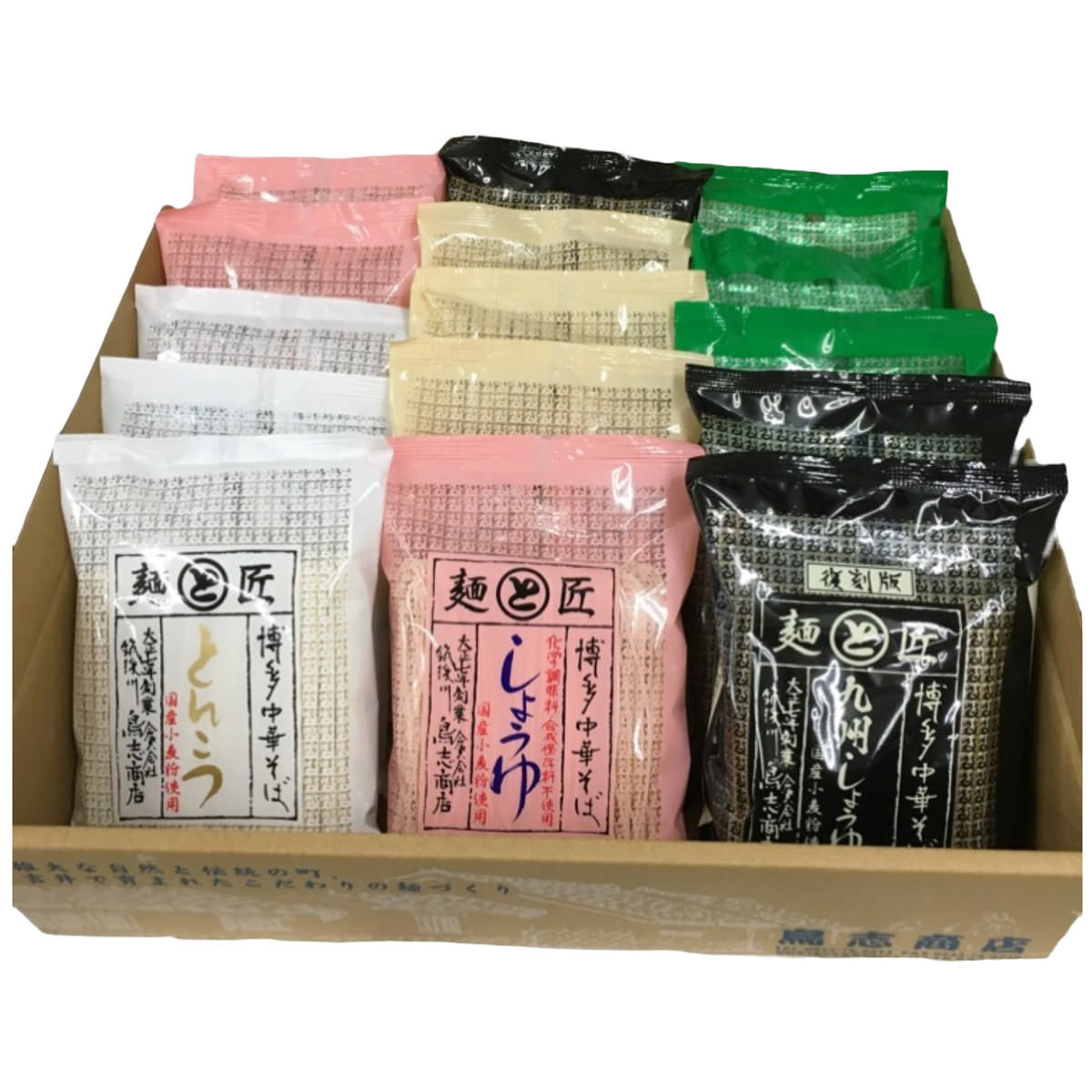 「鳥志商店 博多中華そば」は職人が麺の状態と天候をみくらべて、温度と湿度を調整しながら3日間(約60時間)じっくり熟成乾燥した、小麦の風味豊かでのどごしの良い麺です。【とんこつ】ベースになるパイタンスープには国産豚を使用。あっさりとした豚骨味。【しょうゆ】本醸造丸大豆醤油を使用し、すっきりとした味わいに。酵母エキス不使用。【九州しょうゆ】鴨とネギ主体の深みのある醤油味。【味噌】米味噌と豆味噌をブレンド、本醸造の再仕込み醤油を使用。遺伝子組み換え対象作物はすべて分別品を使用。【塩味】植物性飼料・完全無投薬飼育・平飼いの鶏のガラスープをベースに長崎産天日塩を使用し、十四種類の香辛料をバランスよく配合。
