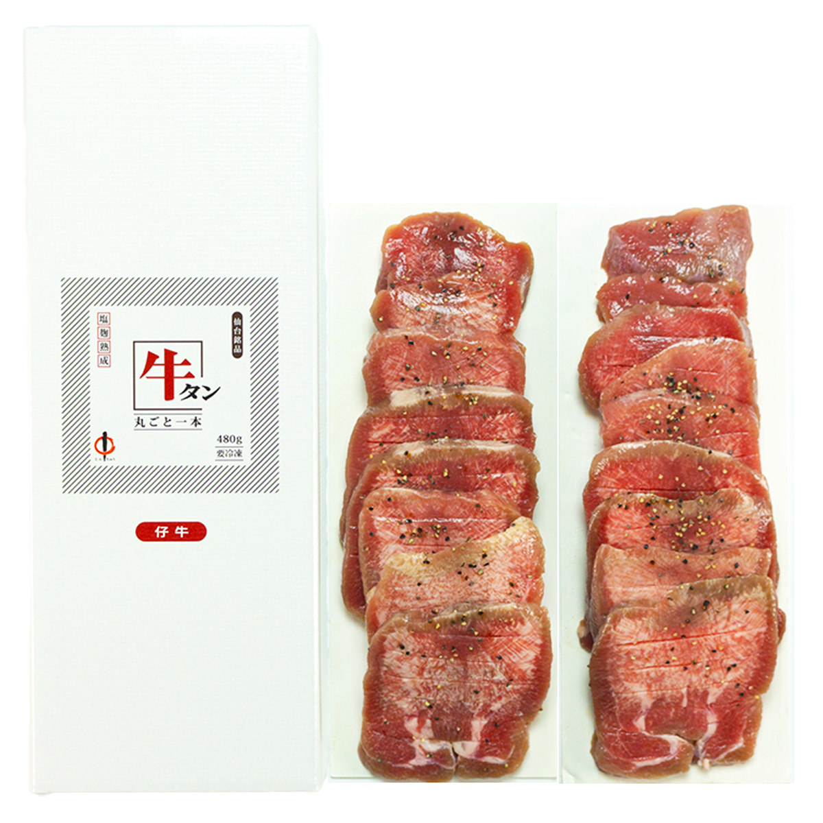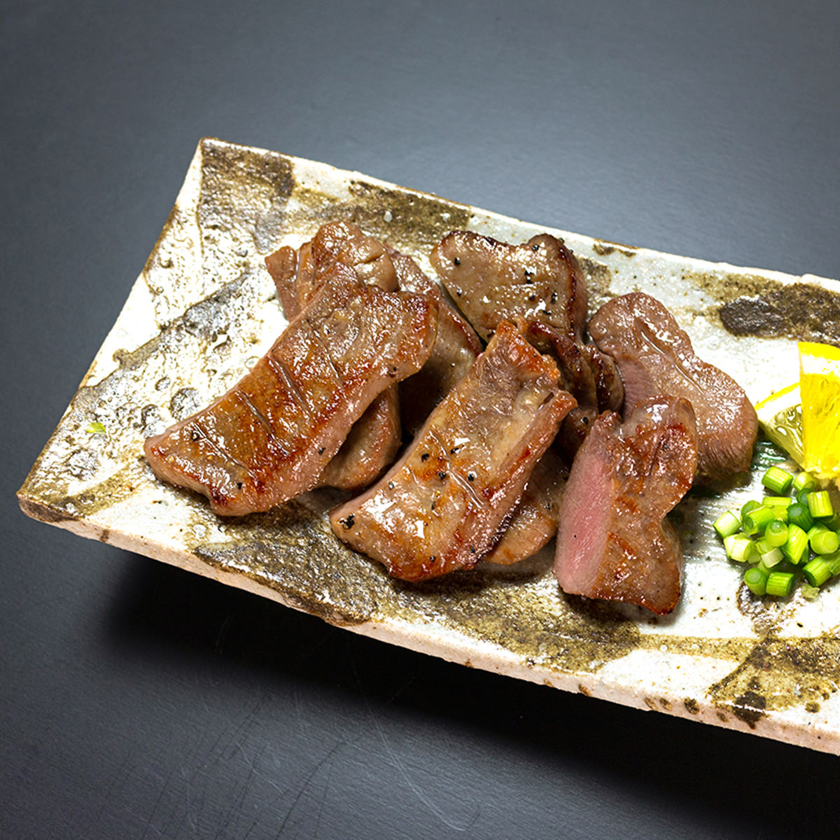 牛タン専門店 陣中の「仔牛の牛タン丸ごと一本 塩麹熟成」です。ミルクを飲んで育ったオランダ産の良質な仔牛「ミルクフェッドヴィール」の牛タンを、塩麹を使った陣中秘伝のタレにじっくりつけ込んだ後に、さらに低温熟成をすることで素材本来の旨みを引き出しました。仔牛ならではのやわらかくプリっとした食感をお楽しみいただけます。「牛タン丸ごと一本」では、「タン元」と呼ばれる根もと付近の脂がのった霜降り部位から、脂身と赤身のバランスの良い「タン中元」、そして「タン中先」という赤身の部位まで食べ比べすることができます。霜降り部位の方が高級とされてはおりますが、お肉の味がしっかりとする赤身部位も負けず劣らず美味しいので、人それぞれお好みの部位を見つけてみてください。