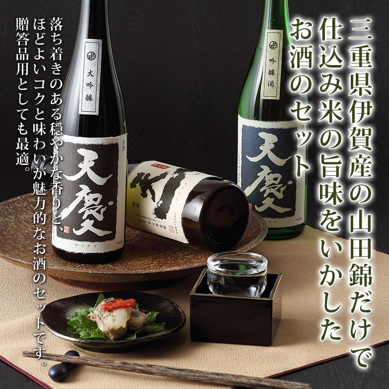 三重県伊賀産の山田錦だけで仕込み、米の旨味を生かした、濃厚なお酒のセットができあがりました。落ち着きのある穏やかな香り、ほどよいコクと味わいが魅力的です。お中元の季節は日本酒がとっても美味しく感じられる時です!ぜひ三重県産酵母で醸した吟醸酒2種とこくと旨味の純米酒の贅沢なセットをギフトとされることをオススメいたします。