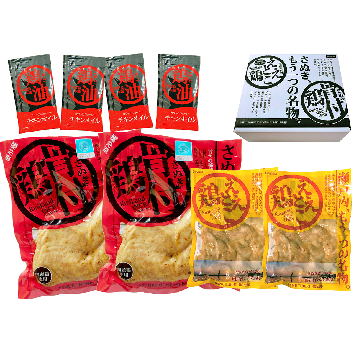 さぬきの名物といえば「さぬきうどん」が有名ですが、実は「さぬき骨付鶏」も有名なご当地グルメです。この名物「さぬき骨付鶏」と「ええとこ鶏」をセットにしてお届けします。さぬき鳥本舗の骨付鶏は、ほんのり香る玉ねぎの甘さとピリッとスパイシーな幻の唐辛子、香川最古の特産農産物で上品な香りと強い辛みをもつ「香川本鷹」、瀬戸内の清澄で安全な海水を原料に平釜で丁寧に作り上げた究極の塩を使用し鶏のうまみたっぷりのチキンオイル鶏油でじっくりと焼き上げ、独自の真空調理技術「旨さの秘訣、真空パック」浸透圧により食材そのものの風味を逃さず、鶏のうまみたっぷりのジューシーな味わいをさらに引き出しています。「ええとこ鶏」は、上品な旨味あふれるプリプリ食感の鶏肉と、瀬戸内産の新鮮なレモンがおりなすジューシーな味わいがたまりません。さぬき、もう一つの名物!うどん県のご当地グルメとして話題の骨付鶏とええとこ鶏をぜひご賞味くださいませ。