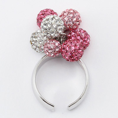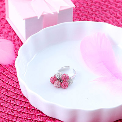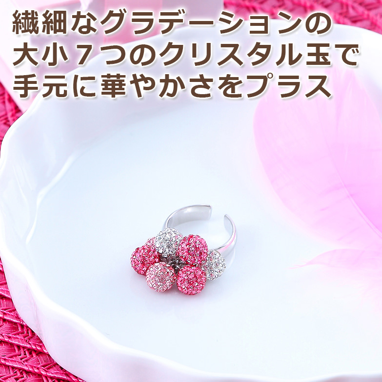 ピンクグラデーションのパヴェクリスタル玉とクリアのパヴェクリスタル玉を丸環で取り付けたリングです。クリスタル玉はリングに固定されていないため、動くたびに揺らめきを魅せ、キラキラとした輝きが、手元をより華やかに演出します。繊細なグラデーションと美しい煌めきは女性らしく、魅力的な手元に見せてくれます。ほどよいボリュームのジュエリーは、華やかなシーンにもぴったりです。C型のリングを使用していますので、多少の調整が可能です。こちらの商品にはギフト用のボックスのご用意がございます。ご希望の方はお申し付けください