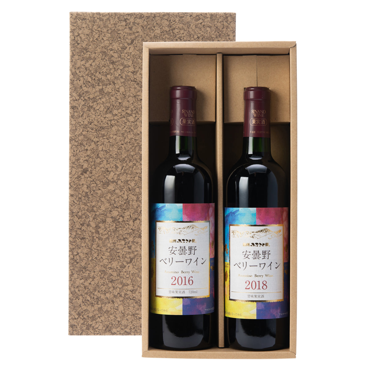 雄大な北アルプスの麓「信州安曇野」の信州ふるさと便農場が丹精込めて育てた色鮮やかな4種類のベリー(赤ラズベリー・黄ラズベリー・ブルーベリー・カシス)を原料に、地元信州のワイナリーで醸造されたベリーワイン(甘味果実酒)2本セットです。色香り良く、ベリーらしい酸味が効いた辛口ワインです。その年のベリー収穫量により原材料の配合割合が違います。お届けする『安曇野ベリーワイン2016・2018 2本セット』の2016年は、ラズベリー:49%、ブルーベリー:44%、カシス:7%とラズベリーの酸味際立つ配合、2018年は、ブルーベリー:65%・カシス:30%・ラズベリー:5%でブルーベリー6割以上の後味がさわやかに仕上がっています。ぜひ飲み比べてその違いをお楽しみください。