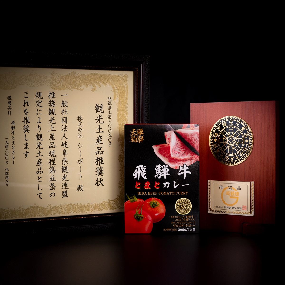 「レトルト 飛騨牛 とまとカレー 飛騨天狗GIFU」は、岐阜県産黒毛和牛【飛騨牛】と、有機栽培にこだわった飛騨高山産トマトを使用した、少しスパイシーなレトルトカレーです。飛騨牛はきめ細かく、やわらかい肉質が特徴です。とろけるような霜降り、芳醇な香りと味わいをお楽しみいただけます。ソテーした玉ねぎとスパイスを合せて、爽やかな酸味のあるトマトとヨーグルト、クリーミーな生クリームを加えて、化学調味料を一切使わずに、スパイシーでマイルドなトマトカレーに仕上げました。常温で長期間保存できるレトルト加工食品ですので、日常のストック、常備品、非常食などに便利です。お召し上がりの際は、湯煎あるいは電子レンジで温めてください。温かいごはんのおとものほか、パスタソースとしてご利用いただくのもおすすめです。本品は岐阜県観光連盟の推奨観光土産品に選定されています。(令和3年度推奨品){調理方法}<湯煎>レトルトパウチのまま水を張った鍋に入れて、沸騰してから3~4分湯煎する。<電子レンジ>カレー耐熱容器に移し、ラップをかけて電子レンジ1~2分加熱する。