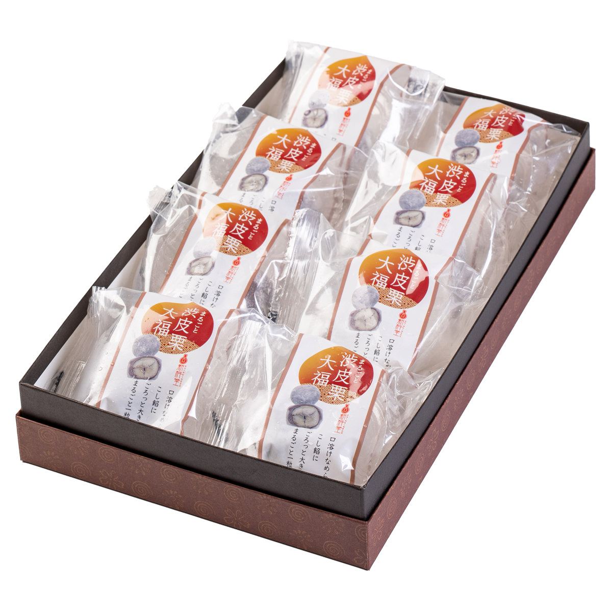 岐阜県中津川市の新杵堂(しんきねどう)がお届けする「新杵堂 まるごと渋皮栗大福 ギフト」です。甘みの強い大粒の栗を職人が選別し、その旨みが凝縮されている渋皮部分をまるごとじっくり煮込んで仕上げました。なめらかなこし餡と大、ごろっとした大粒の渋皮栗まるごと一粒を羽二重餅で包みました。職人が一つひとつ手作業で丁寧に仕上げた逸品です。おやつ、お茶請け、茶菓子などとして、おいしい栗大福をお取り寄せでお楽しみください。化粧箱に入れてお届けしますので、プレゼント、贈答品、ギフトなどにもおすすめです。※冷蔵庫にて6~7時間解凍してお召し上がりください。解凍後は賞味期限にかかわらず、お早めにお召し上がりください。