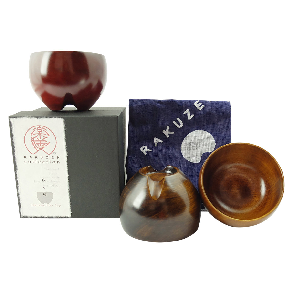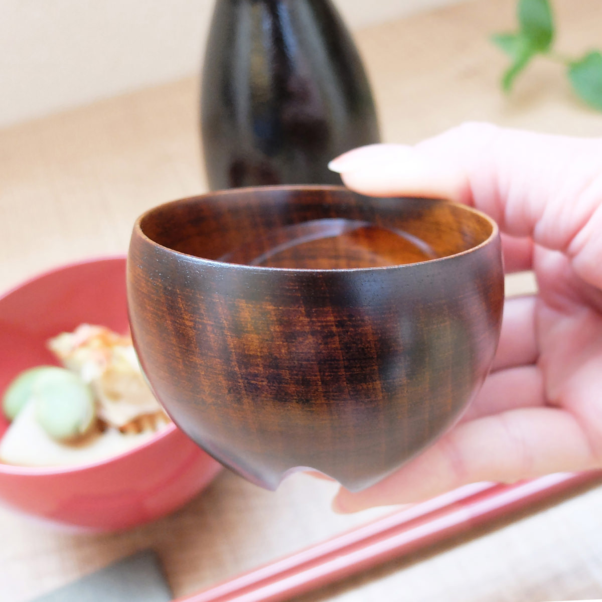 福島県会津地方の民芸品、起き上がり小法師のように、倒れても起き上がる漆塗りのぐいのみです。底部に重心のある構造のため倒れにくく、底部に施したカットに指が掛かり持ちやすいのが特徴です。酔っ払っても安心なのはもちろん、握力が弱ってきたシニアや目や手に障がいがある方もお酒の時間を楽しめるぐいのみです。機能性と、二本足で立っているようなかわいらしい形がお酒の時間を楽しくします。さらに日本酒の香りを楽しむ仕掛けもあります。内側底に設けた突起構造は、注いだお酒がぶつかり対流して香りを立ちやすくします。持ちやすく安定感があり割れにくい木製であることから、1~2歳くらいの赤ちゃんがコップ練習をする器としても使えます。赤ちゃんが大人になったら親子でお酒を交わすというように、末永く人生に寄り添える器です。制作を手がけるのは福島県の会津漆器職人。漆塗りの口あたりと木目のぬくもりを両方楽しめる「拭き漆」で仕上げました。拭き漆は使うほどに木目がはっきり出てきて、漆の色も鮮やかに変わっていきます。 また、傷がついても目立ちにくい仕上げですので、普段使いにもぴったりです。 漆器初心者の方でもカジュアルに使っていただけます。毎日使って、自分だけの器に育ててください。※2014グッドデザイン賞受賞(楽膳シリーズ)